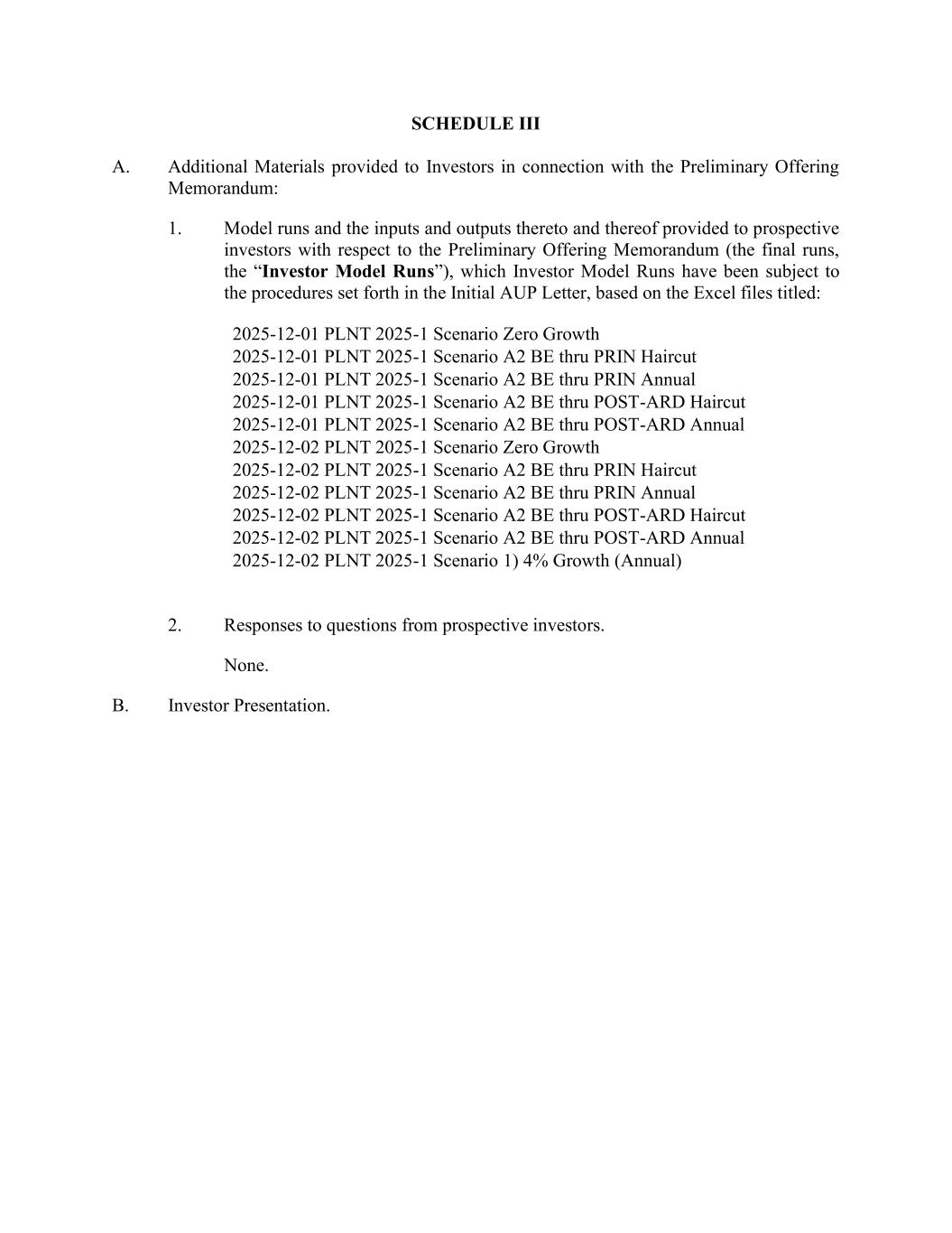 SCHEDULE III A. Additional Materials provided to Investors in connection with the Preliminary Offering Memorandum: 1. Model runs and the inputs and outputs thereto and thereof provided to prospective investors with respect to the Preliminary Offering Memorandum (the final runs, the “Investor Model Runs”), which Investor Model Runs have been subject to the procedures set forth in the Initial AUP Letter, based on the Excel files titled: 2025-12-01 PLNT 2025-1 Scenario Zero Growth 2025-12-01 PLNT 2025-1 Scenario A2 BE thru PRIN Haircut 2025-12-01 PLNT 2025-1 Scenario A2 BE thru PRIN Annual 2025-12-01 PLNT 2025-1 Scenario A2 BE thru POST-ARD Haircut 2025-12-01 PLNT 2025-1 Scenario A2 BE thru POST-ARD Annual 2025-12-02 PLNT 2025-1 Scenario Zero Growth 2025-12-02 PLNT 2025-1 Scenario A2 BE thru PRIN Haircut 2025-12-02 PLNT 2025-1 Scenario A2 BE thru PRIN Annual 2025-12-02 PLNT 2025-1 Scenario A2 BE thru POST-ARD Haircut 2025-12-02 PLNT 2025-1 Scenario A2 BE thru POST-ARD Annual 2025-12-02 PLNT 2025-1 Scenario 1) 4% Growth (Annual) 2. Responses to questions from prospective investors. None. B. Investor Presentation.