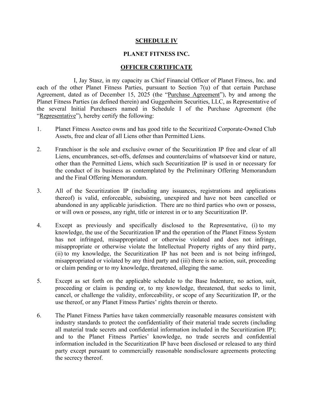 SCHEDULE IV PLANET FITNESS INC. OFFICER CERTIFICATE I, Jay Stasz, in my capacity as Chief Financial Officer of Planet Fitness, Inc. and each of the other Planet Fitness Parties, pursuant to Section 7(u) of that certain Purchase Agreement, dated as of December 15, 2025 (the “Purchase Agreement”), by and among the Planet Fitness Parties (as defined therein) and Guggenheim Securities, LLC, as Representative of the several Initial Purchasers named in Schedule I of the Purchase Agreement (the “Representative”), hereby certify the following: 1. Planet Fitness Assetco owns and has good title to the Securitized Corporate-Owned Club Assets, free and clear of all Liens other than Permitted Liens. 2. Franchisor is the sole and exclusive owner of the Securitization IP free and clear of all Liens, encumbrances, set-offs, defenses and counterclaims of whatsoever kind or nature, other than the Permitted Liens, which such Securitization IP is used in or necessary for the conduct of its business as contemplated by the Preliminary Offering Memorandum and the Final Offering Memorandum. 3. All of the Securitization IP (including any issuances, registrations and applications thereof) is valid, enforceable, subsisting, unexpired and have not been cancelled or abandoned in any applicable jurisdiction. There are no third parties who own or possess, or will own or possess, any right, title or interest in or to any Securitization IP. 4. Except as previously and specifically disclosed to the Representative, (i) to my knowledge, the use of the Securitization IP and the operation of the Planet Fitness System has not infringed, misappropriated or otherwise violated and does not infringe, misappropriate or otherwise violate the Intellectual Property rights of any third party, (ii) to my knowledge, the Securitization IP has not been and is not being infringed, misappropriated or violated by any third party and (iii) there is no action, suit, proceeding or claim pending or to my knowledge, threatened, alleging the same. 5. Except as set forth on the applicable schedule to the Base Indenture, no action, suit, proceeding or claim is pending or, to my knowledge, threatened, that seeks to limit, cancel, or challenge the validity, enforceability, or scope of any Securitization IP, or the use thereof, or any Planet Fitness Parties’ rights therein or thereto. 6. The Planet Fitness Parties have taken commercially reasonable measures consistent with industry standards to protect the confidentiality of their material trade secrets (including all material trade secrets and confidential information included in the Securitization IP); and to the Planet Fitness Parties’ knowledge, no trade secrets and confidential information included in the Securitization IP have been disclosed or released to any third party except pursuant to commercially reasonable nondisclosure agreements protecting the secrecy thereof.