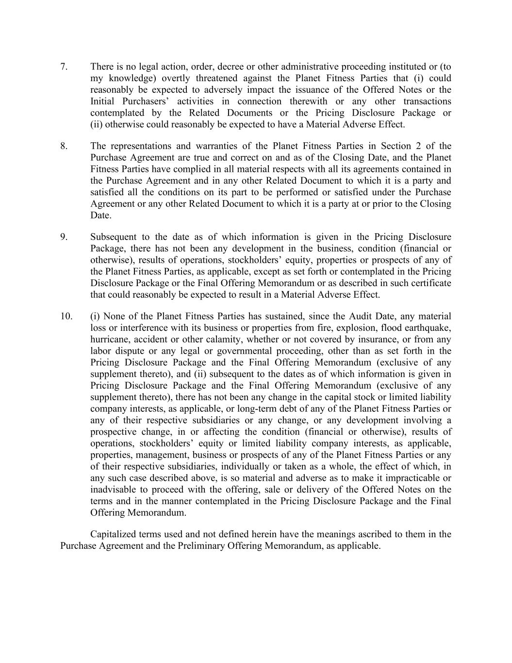 7. There is no legal action, order, decree or other administrative proceeding instituted or (to my knowledge) overtly threatened against the Planet Fitness Parties that (i) could reasonably be expected to adversely impact the issuance of the Offered Notes or the Initial Purchasers’ activities in connection therewith or any other transactions contemplated by the Related Documents or the Pricing Disclosure Package or (ii) otherwise could reasonably be expected to have a Material Adverse Effect. 8. The representations and warranties of the Planet Fitness Parties in Section 2 of the Purchase Agreement are true and correct on and as of the Closing Date, and the Planet Fitness Parties have complied in all material respects with all its agreements contained in the Purchase Agreement and in any other Related Document to which it is a party and satisfied all the conditions on its part to be performed or satisfied under the Purchase Agreement or any other Related Document to which it is a party at or prior to the Closing Date. 9. Subsequent to the date as of which information is given in the Pricing Disclosure Package, there has not been any development in the business, condition (financial or otherwise), results of operations, stockholders’ equity, properties or prospects of any of the Planet Fitness Parties, as applicable, except as set forth or contemplated in the Pricing Disclosure Package or the Final Offering Memorandum or as described in such certificate that could reasonably be expected to result in a Material Adverse Effect. 10. (i) None of the Planet Fitness Parties has sustained, since the Audit Date, any material loss or interference with its business or properties from fire, explosion, flood earthquake, hurricane, accident or other calamity, whether or not covered by insurance, or from any labor dispute or any legal or governmental proceeding, other than as set forth in the Pricing Disclosure Package and the Final Offering Memorandum (exclusive of any supplement thereto), and (ii) subsequent to the dates as of which information is given in Pricing Disclosure Package and the Final Offering Memorandum (exclusive of any supplement thereto), there has not been any change in the capital stock or limited liability company interests, as applicable, or long-term debt of any of the Planet Fitness Parties or any of their respective subsidiaries or any change, or any development involving a prospective change, in or affecting the condition (financial or otherwise), results of operations, stockholders’ equity or limited liability company interests, as applicable, properties, management, business or prospects of any of the Planet Fitness Parties or any of their respective subsidiaries, individually or taken as a whole, the effect of which, in any such case described above, is so material and adverse as to make it impracticable or inadvisable to proceed with the offering, sale or delivery of the Offered Notes on the terms and in the manner contemplated in the Pricing Disclosure Package and the Final Offering Memorandum. Capitalized terms used and not defined herein have the meanings ascribed to them in the Purchase Agreement and the Preliminary Offering Memorandum, as applicable.