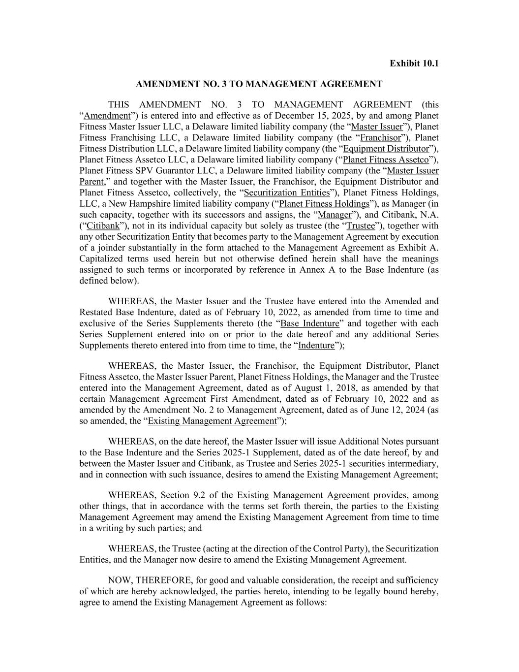 Exhibit 10.1 AMENDMENT NO. 3 TO MANAGEMENT AGREEMENT THIS AMENDMENT NO. 3 TO MANAGEMENT AGREEMENT (this “Amendment”) is entered into and effective as of December 15, 2025, by and among Planet Fitness Master Issuer LLC, a Delaware limited liability company (the “Master Issuer”), Planet Fitness Franchising LLC, a Delaware limited liability company (the “Franchisor”), Planet Fitness Distribution LLC, a Delaware limited liability company (the “Equipment Distributor”), Planet Fitness Assetco LLC, a Delaware limited liability company (“Planet Fitness Assetco”), Planet Fitness SPV Guarantor LLC, a Delaware limited liability company (the “Master Issuer Parent,” and together with the Master Issuer, the Franchisor, the Equipment Distributor and Planet Fitness Assetco, collectively, the “Securitization Entities”), Planet Fitness Holdings, LLC, a New Hampshire limited liability company (“Planet Fitness Holdings”), as Manager (in such capacity, together with its successors and assigns, the “Manager”), and Citibank, N.A. (“Citibank”), not in its individual capacity but solely as trustee (the “Trustee”), together with any other Securitization Entity that becomes party to the Management Agreement by execution of a joinder substantially in the form attached to the Management Agreement as Exhibit A. Capitalized terms used herein but not otherwise defined herein shall have the meanings assigned to such terms or incorporated by reference in Annex A to the Base Indenture (as defined below). WHEREAS, the Master Issuer and the Trustee have entered into the Amended and Restated Base Indenture, dated as of February 10, 2022, as amended from time to time and exclusive of the Series Supplements thereto (the “Base Indenture” and together with each Series Supplement entered into on or prior to the date hereof and any additional Series Supplements thereto entered into from time to time, the “Indenture”); WHEREAS, the Master Issuer, the Franchisor, the Equipment Distributor, Planet Fitness Assetco, the Master Issuer Parent, Planet Fitness Holdings, the Manager and the Trustee entered into the Management Agreement, dated as of August 1, 2018, as amended by that certain Management Agreement First Amendment, dated as of February 10, 2022 and as amended by the Amendment No. 2 to Management Agreement, dated as of June 12, 2024 (as so amended, the “Existing Management Agreement”); WHEREAS, on the date hereof, the Master Issuer will issue Additional Notes pursuant to the Base Indenture and the Series 2025-1 Supplement, dated as of the date hereof, by and between the Master Issuer and Citibank, as Trustee and Series 2025-1 securities intermediary, and in connection with such issuance, desires to amend the Existing Management Agreement; WHEREAS, Section 9.2 of the Existing Management Agreement provides, among other things, that in accordance with the terms set forth therein, the parties to the Existing Management Agreement may amend the Existing Management Agreement from time to time in a writing by such parties; and WHEREAS, the Trustee (acting at the direction of the Control Party), the Securitization Entities, and the Manager now desire to amend the Existing Management Agreement. NOW, THEREFORE, for good and valuable consideration, the receipt and sufficiency of which are hereby acknowledged, the parties hereto, intending to be legally bound hereby, agree to amend the Existing Management Agreement as follows: