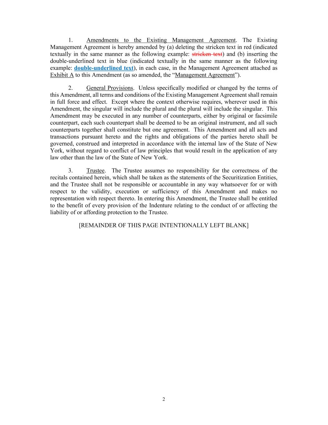 2 1. Amendments to the Existing Management Agreement. The Existing Management Agreement is hereby amended by (a) deleting the stricken text in red (indicated textually in the same manner as the following example: stricken text) and (b) inserting the double-underlined text in blue (indicated textually in the same manner as the following example: double-underlined text), in each case, in the Management Agreement attached as Exhibit A to this Amendment (as so amended, the “Management Agreement”). 2. General Provisions. Unless specifically modified or changed by the terms of this Amendment, all terms and conditions of the Existing Management Agreement shall remain in full force and effect. Except where the context otherwise requires, wherever used in this Amendment, the singular will include the plural and the plural will include the singular. This Amendment may be executed in any number of counterparts, either by original or facsimile counterpart, each such counterpart shall be deemed to be an original instrument, and all such counterparts together shall constitute but one agreement. This Amendment and all acts and transactions pursuant hereto and the rights and obligations of the parties hereto shall be governed, construed and interpreted in accordance with the internal law of the State of New York, without regard to conflict of law principles that would result in the application of any law other than the law of the State of New York. 3. Trustee. The Trustee assumes no responsibility for the correctness of the recitals contained herein, which shall be taken as the statements of the Securitization Entities, and the Trustee shall not be responsible or accountable in any way whatsoever for or with respect to the validity, execution or sufficiency of this Amendment and makes no representation with respect thereto. In entering this Amendment, the Trustee shall be entitled to the benefit of every provision of the Indenture relating to the conduct of or affecting the liability of or affording protection to the Trustee. [REMAINDER OF THIS PAGE INTENTIONALLY LEFT BLANK]