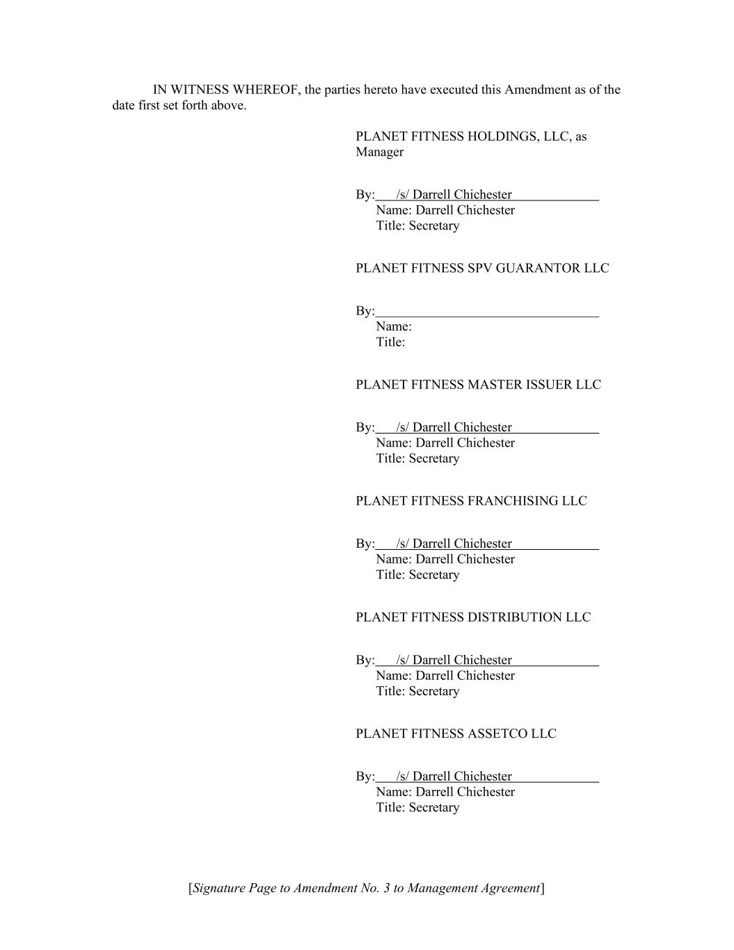 [Signature Page to Amendment No. 3 to Management Agreement] IN WITNESS WHEREOF, the parties hereto have executed this Amendment as of the date first set forth above. PLANET FITNESS HOLDINGS, LLC, as Manager By: /s/ Darrell Chichester Name: Darrell Chichester Title: Secretary PLANET FITNESS SPV GUARANTOR LLC By: Name: Title: PLANET FITNESS MASTER ISSUER LLC By: /s/ Darrell Chichester Name: Darrell Chichester Title: Secretary PLANET FITNESS FRANCHISING LLC By: /s/ Darrell Chichester Name: Darrell Chichester Title: Secretary PLANET FITNESS DISTRIBUTION LLC By: /s/ Darrell Chichester Name: Darrell Chichester Title: Secretary PLANET FITNESS ASSETCO LLC By: /s/ Darrell Chichester Name: Darrell Chichester Title: Secretary