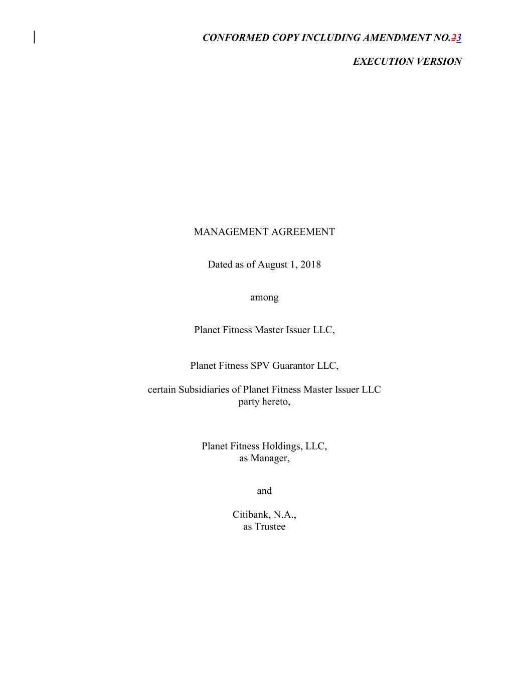 CONFORMED COPY INCLUDING AMENDMENT NO.23 EXECUTION VERSION MANAGEMENT AGREEMENT Dated as of August 1, 2018 among Planet Fitness Master Issuer LLC, Planet Fitness SPV Guarantor LLC, certain Subsidiaries of Planet Fitness Master Issuer LLC party hereto, Planet Fitness Holdings, LLC, as Manager, and Citibank, N.A., as Trustee