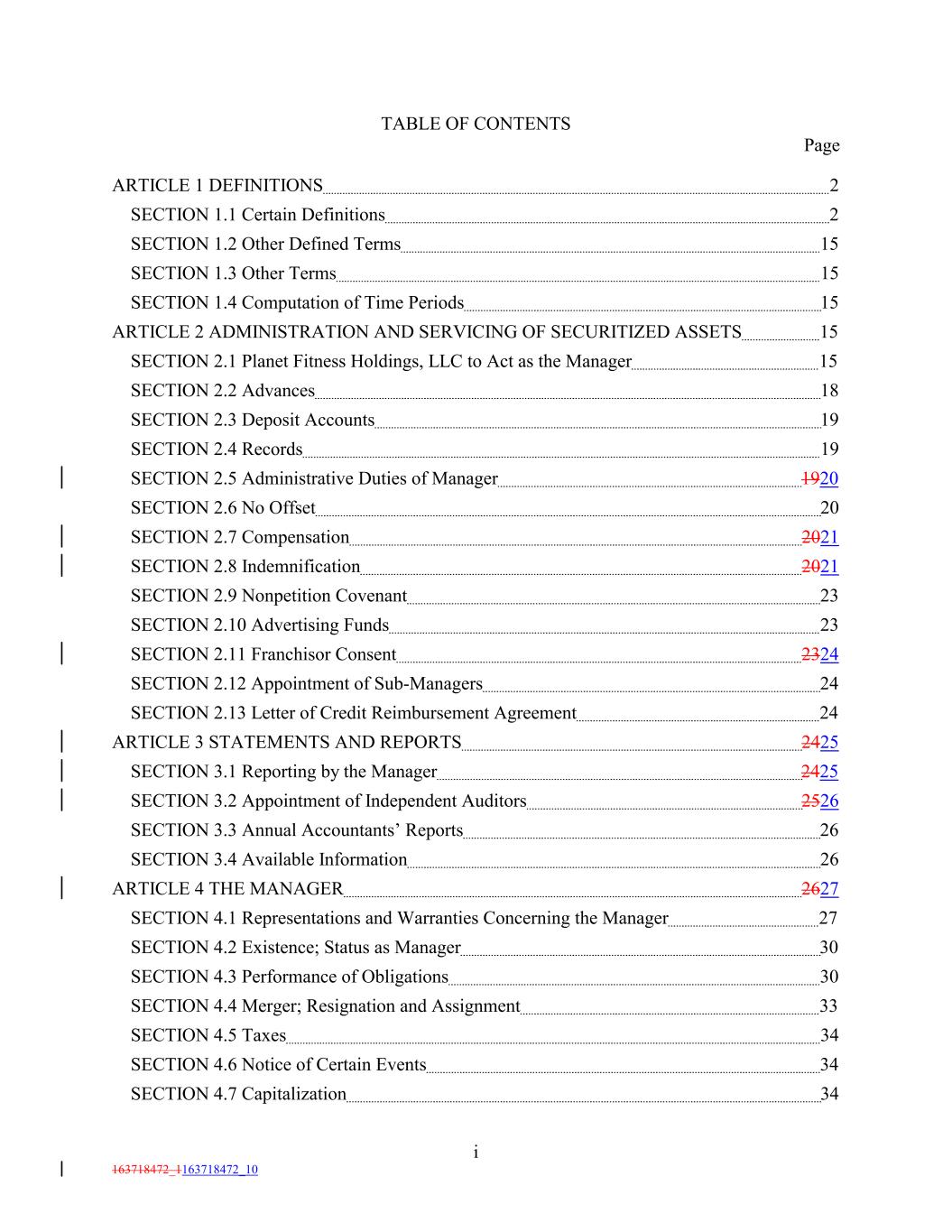TABLE OF CONTENTS Page ARTICLE 1 DEFINITIONS 2 SECTION 1.1 Certain Definitions 2 SECTION 1.2 Other Defined Terms 15 SECTION 1.3 Other Terms 15 SECTION 1.4 Computation of Time Periods 15 ARTICLE 2 ADMINISTRATION AND SERVICING OF SECURITIZED ASSETS 15 SECTION 2.1 Planet Fitness Holdings, LLC to Act as the Manager 15 SECTION 2.2 Advances 18 SECTION 2.3 Deposit Accounts 19 SECTION 2.4 Records 19 SECTION 2.5 Administrative Duties of Manager 1920 SECTION 2.6 No Offset 20 SECTION 2.7 Compensation 2021 SECTION 2.8 Indemnification 2021 SECTION 2.9 Nonpetition Covenant 23 SECTION 2.10 Advertising Funds 23 SECTION 2.11 Franchisor Consent 2324 SECTION 2.12 Appointment of Sub-Managers 24 SECTION 2.13 Letter of Credit Reimbursement Agreement 24 ARTICLE 3 STATEMENTS AND REPORTS 2425 SECTION 3.1 Reporting by the Manager 2425 SECTION 3.2 Appointment of Independent Auditors 2526 SECTION 3.3 Annual Accountants’ Reports 26 SECTION 3.4 Available Information 26 ARTICLE 4 THE MANAGER 2627 SECTION 4.1 Representations and Warranties Concerning the Manager 27 SECTION 4.2 Existence; Status as Manager 30 SECTION 4.3 Performance of Obligations 30 SECTION 4.4 Merger; Resignation and Assignment 33 SECTION 4.5 Taxes 34 SECTION 4.6 Notice of Certain Events 34 SECTION 4.7 Capitalization 34 i 163718472_1163718472_10