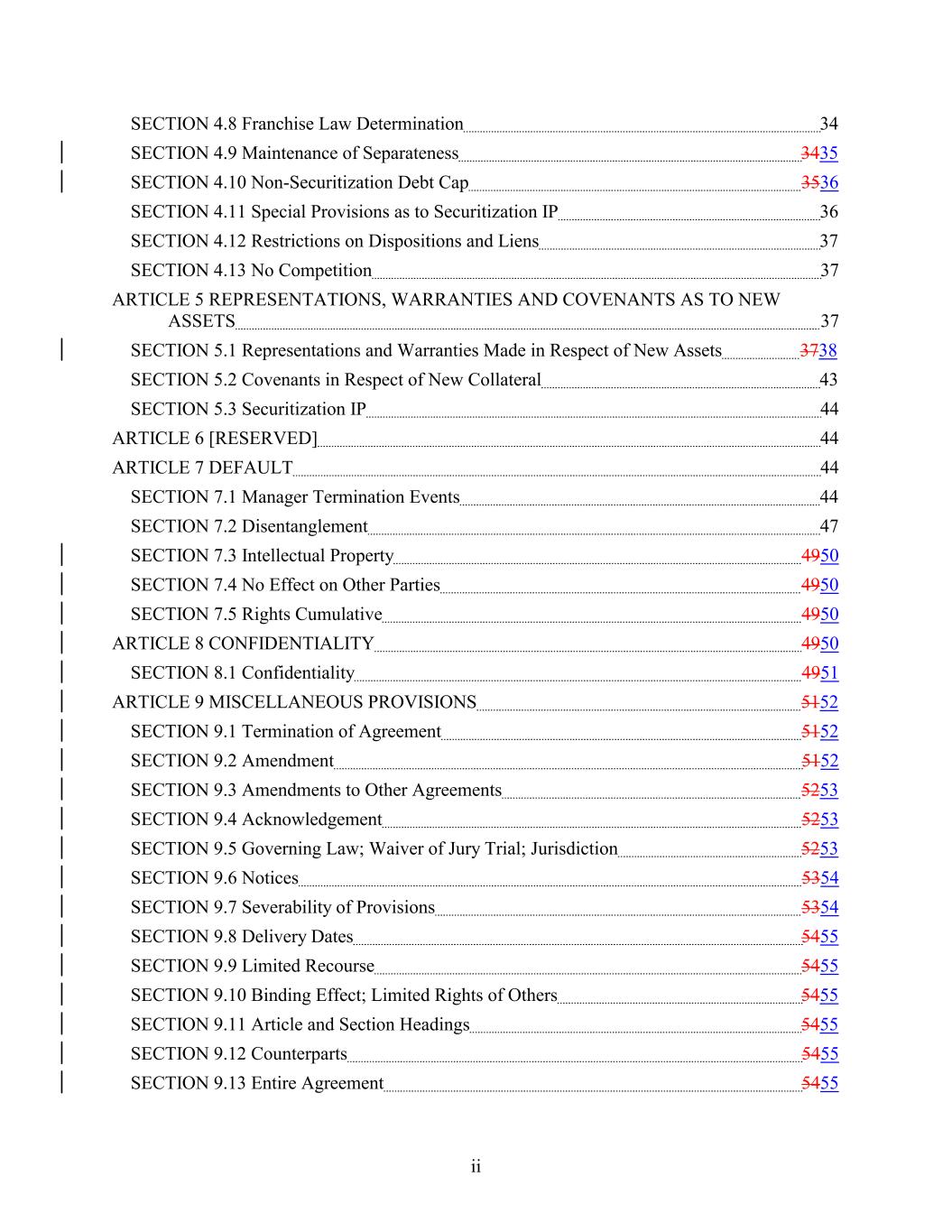 SECTION 4.8 Franchise Law Determination 34 SECTION 4.9 Maintenance of Separateness 3435 SECTION 4.10 Non-Securitization Debt Cap 3536 SECTION 4.11 Special Provisions as to Securitization IP 36 SECTION 4.12 Restrictions on Dispositions and Liens 37 SECTION 4.13 No Competition 37 ARTICLE 5 REPRESENTATIONS, WARRANTIES AND COVENANTS AS TO NEW ASSETS 37 SECTION 5.1 Representations and Warranties Made in Respect of New Assets 3738 SECTION 5.2 Covenants in Respect of New Collateral 43 SECTION 5.3 Securitization IP 44 ARTICLE 6 [RESERVED] 44 ARTICLE 7 DEFAULT 44 SECTION 7.1 Manager Termination Events 44 SECTION 7.2 Disentanglement 47 SECTION 7.3 Intellectual Property 4950 SECTION 7.4 No Effect on Other Parties 4950 SECTION 7.5 Rights Cumulative 4950 ARTICLE 8 CONFIDENTIALITY 4950 SECTION 8.1 Confidentiality 4951 ARTICLE 9 MISCELLANEOUS PROVISIONS 5152 SECTION 9.1 Termination of Agreement 5152 SECTION 9.2 Amendment 5152 SECTION 9.3 Amendments to Other Agreements 5253 SECTION 9.4 Acknowledgement 5253 SECTION 9.5 Governing Law; Waiver of Jury Trial; Jurisdiction 5253 SECTION 9.6 Notices 5354 SECTION 9.7 Severability of Provisions 5354 SECTION 9.8 Delivery Dates 5455 SECTION 9.9 Limited Recourse 5455 SECTION 9.10 Binding Effect; Limited Rights of Others 5455 SECTION 9.11 Article and Section Headings 5455 SECTION 9.12 Counterparts 5455 SECTION 9.13 Entire Agreement 5455 ii