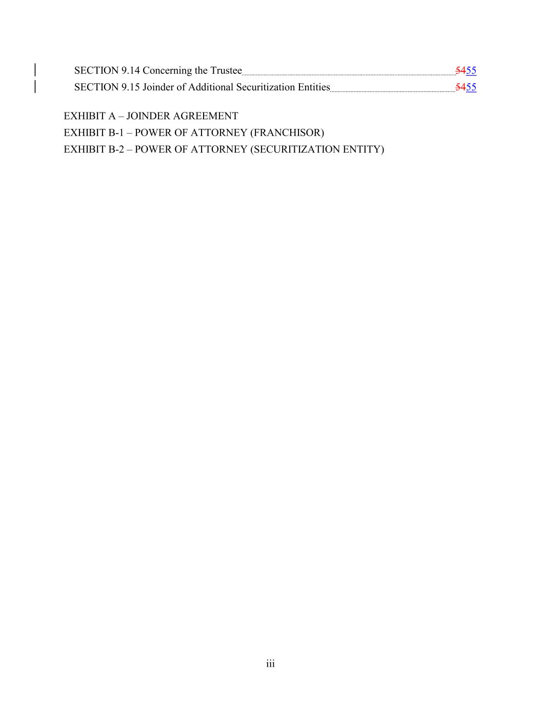 SECTION 9.14 Concerning the Trustee 5455 SECTION 9.15 Joinder of Additional Securitization Entities 5455 EXHIBIT A – JOINDER AGREEMENT EXHIBIT B-1 – POWER OF ATTORNEY (FRANCHISOR) EXHIBIT B-2 – POWER OF ATTORNEY (SECURITIZATION ENTITY) iii
