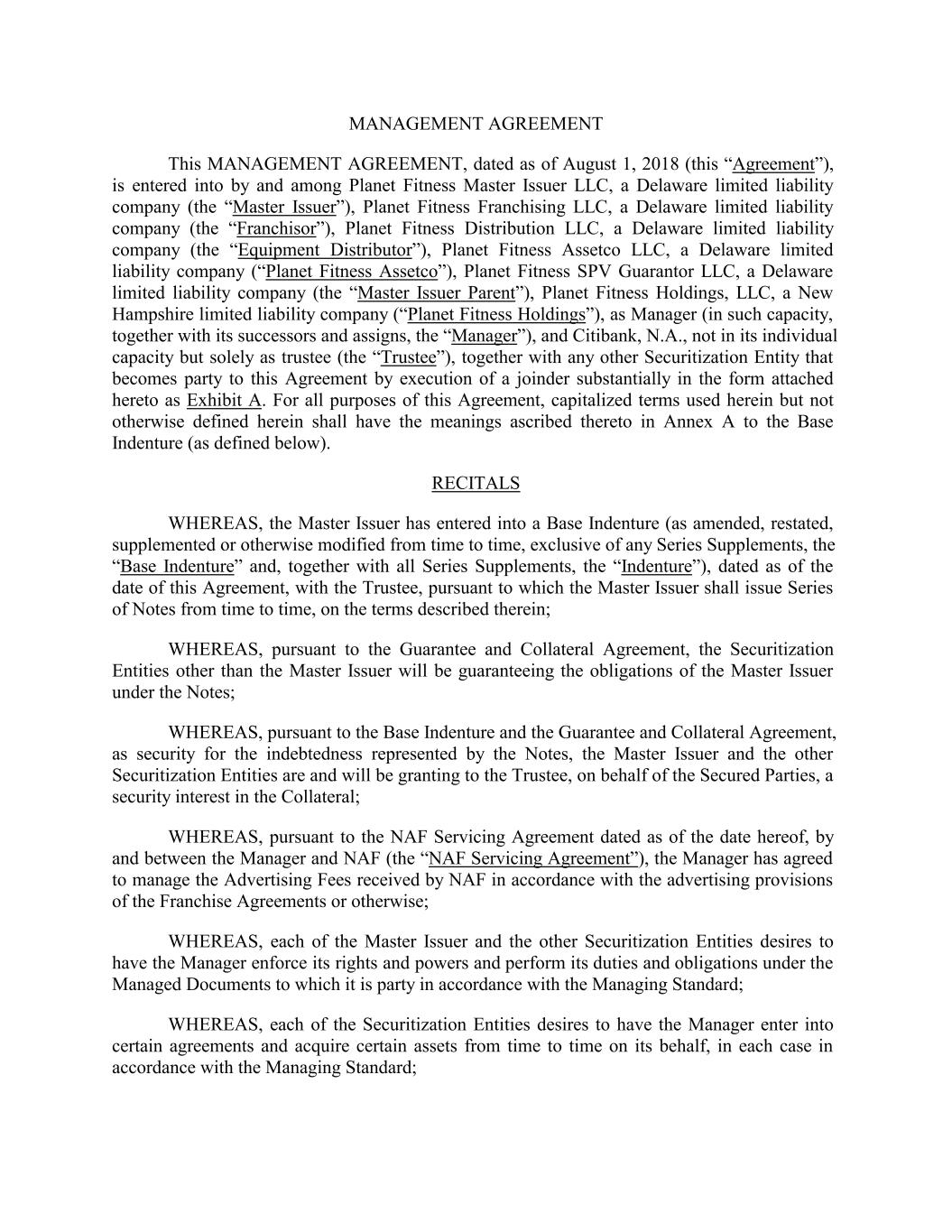 MANAGEMENT AGREEMENT This MANAGEMENT AGREEMENT, dated as of August 1, 2018 (this “Agreement”), is entered into by and among Planet Fitness Master Issuer LLC, a Delaware limited liability company (the “Master Issuer”), Planet Fitness Franchising LLC, a Delaware limited liability company (the “Franchisor”), Planet Fitness Distribution LLC, a Delaware limited liability company (the “Equipment Distributor”), Planet Fitness Assetco LLC, a Delaware limited liability company (“Planet Fitness Assetco”), Planet Fitness SPV Guarantor LLC, a Delaware limited liability company (the “Master Issuer Parent”), Planet Fitness Holdings, LLC, a New Hampshire limited liability company (“Planet Fitness Holdings”), as Manager (in such capacity, together with its successors and assigns, the “Manager”), and Citibank, N.A., not in its individual capacity but solely as trustee (the “Trustee”), together with any other Securitization Entity that becomes party to this Agreement by execution of a joinder substantially in the form attached hereto as Exhibit A. For all purposes of this Agreement, capitalized terms used herein but not otherwise defined herein shall have the meanings ascribed thereto in Annex A to the Base Indenture (as defined below). RECITALS WHEREAS, the Master Issuer has entered into a Base Indenture (as amended, restated, supplemented or otherwise modified from time to time, exclusive of any Series Supplements, the “Base Indenture” and, together with all Series Supplements, the “Indenture”), dated as of the date of this Agreement, with the Trustee, pursuant to which the Master Issuer shall issue Series of Notes from time to time, on the terms described therein; WHEREAS, pursuant to the Guarantee and Collateral Agreement, the Securitization Entities other than the Master Issuer will be guaranteeing the obligations of the Master Issuer under the Notes; WHEREAS, pursuant to the Base Indenture and the Guarantee and Collateral Agreement, as security for the indebtedness represented by the Notes, the Master Issuer and the other Securitization Entities are and will be granting to the Trustee, on behalf of the Secured Parties, a security interest in the Collateral; WHEREAS, pursuant to the NAF Servicing Agreement dated as of the date hereof, by and between the Manager and NAF (the “NAF Servicing Agreement”), the Manager has agreed to manage the Advertising Fees received by NAF in accordance with the advertising provisions of the Franchise Agreements or otherwise; WHEREAS, each of the Master Issuer and the other Securitization Entities desires to have the Manager enforce its rights and powers and perform its duties and obligations under the Managed Documents to which it is party in accordance with the Managing Standard; WHEREAS, each of the Securitization Entities desires to have the Manager enter into certain agreements and acquire certain assets from time to time on its behalf, in each case in accordance with the Managing Standard;