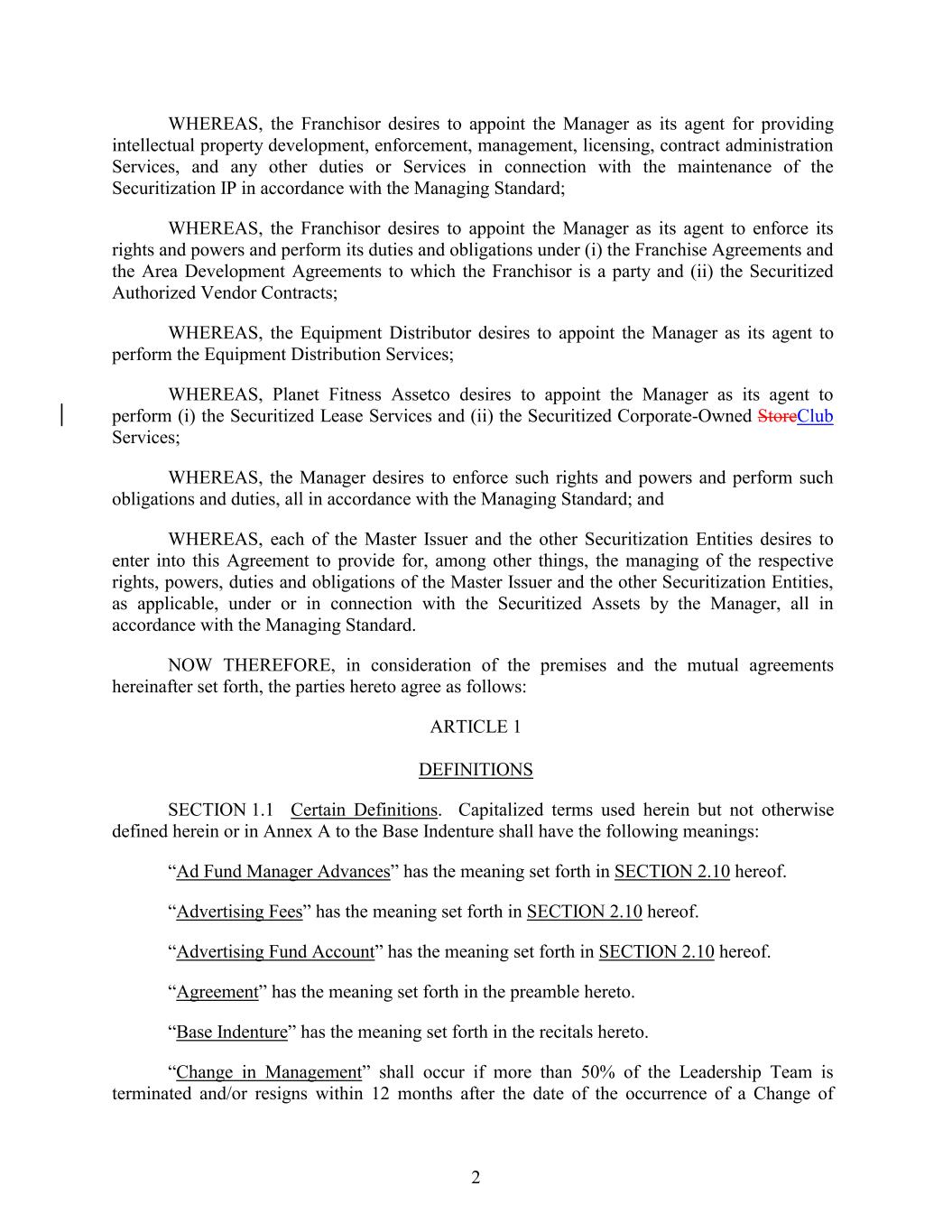 WHEREAS, the Franchisor desires to appoint the Manager as its agent for providing intellectual property development, enforcement, management, licensing, contract administration Services, and any other duties or Services in connection with the maintenance of the Securitization IP in accordance with the Managing Standard; WHEREAS, the Franchisor desires to appoint the Manager as its agent to enforce its rights and powers and perform its duties and obligations under (i) the Franchise Agreements and the Area Development Agreements to which the Franchisor is a party and (ii) the Securitized Authorized Vendor Contracts; WHEREAS, the Equipment Distributor desires to appoint the Manager as its agent to perform the Equipment Distribution Services; WHEREAS, Planet Fitness Assetco desires to appoint the Manager as its agent to perform (i) the Securitized Lease Services and (ii) the Securitized Corporate-Owned StoreClub Services; WHEREAS, the Manager desires to enforce such rights and powers and perform such obligations and duties, all in accordance with the Managing Standard; and WHEREAS, each of the Master Issuer and the other Securitization Entities desires to enter into this Agreement to provide for, among other things, the managing of the respective rights, powers, duties and obligations of the Master Issuer and the other Securitization Entities, as applicable, under or in connection with the Securitized Assets by the Manager, all in accordance with the Managing Standard. NOW THEREFORE, in consideration of the premises and the mutual agreements hereinafter set forth, the parties hereto agree as follows: ARTICLE 1 DEFINITIONS SECTION 1.1 Certain Definitions. Capitalized terms used herein but not otherwise defined herein or in Annex A to the Base Indenture shall have the following meanings: “Ad Fund Manager Advances” has the meaning set forth in SECTION 2.10 hereof. “Advertising Fees” has the meaning set forth in SECTION 2.10 hereof. “Advertising Fund Account” has the meaning set forth in SECTION 2.10 hereof. “Agreement” has the meaning set forth in the preamble hereto. “Base Indenture” has the meaning set forth in the recitals hereto. “Change in Management” shall occur if more than 50% of the Leadership Team is terminated and/or resigns within 12 months after the date of the occurrence of a Change of 2
