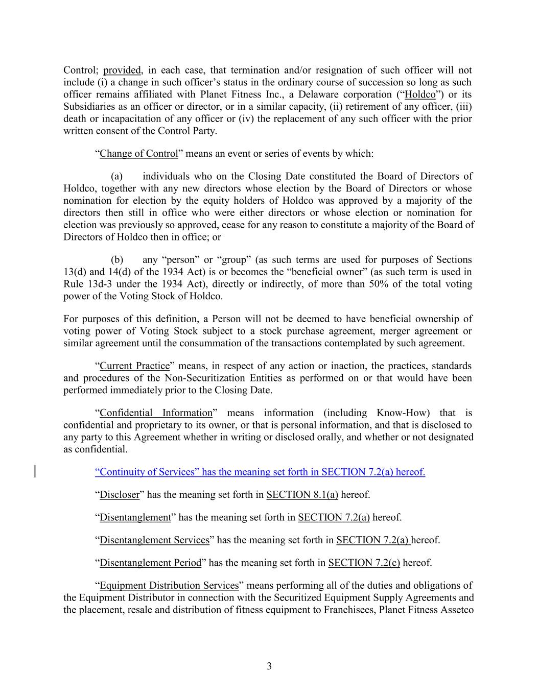 Control; provided, in each case, that termination and/or resignation of such officer will not include (i) a change in such officer’s status in the ordinary course of succession so long as such officer remains affiliated with Planet Fitness Inc., a Delaware corporation (“Holdco”) or its Subsidiaries as an officer or director, or in a similar capacity, (ii) retirement of any officer, (iii) death or incapacitation of any officer or (iv) the replacement of any such officer with the prior written consent of the Control Party. “Change of Control” means an event or series of events by which: (a) individuals who on the Closing Date constituted the Board of Directors of Holdco, together with any new directors whose election by the Board of Directors or whose nomination for election by the equity holders of Holdco was approved by a majority of the directors then still in office who were either directors or whose election or nomination for election was previously so approved, cease for any reason to constitute a majority of the Board of Directors of Holdco then in office; or (b) any “person” or “group” (as such terms are used for purposes of Sections 13(d) and 14(d) of the 1934 Act) is or becomes the “beneficial owner” (as such term is used in Rule 13d-3 under the 1934 Act), directly or indirectly, of more than 50% of the total voting power of the Voting Stock of Holdco. For purposes of this definition, a Person will not be deemed to have beneficial ownership of voting power of Voting Stock subject to a stock purchase agreement, merger agreement or similar agreement until the consummation of the transactions contemplated by such agreement. “Current Practice” means, in respect of any action or inaction, the practices, standards and procedures of the Non-Securitization Entities as performed on or that would have been performed immediately prior to the Closing Date. “Confidential Information” means information (including Know-How) that is confidential and proprietary to its owner, or that is personal information, and that is disclosed to any party to this Agreement whether in writing or disclosed orally, and whether or not designated as confidential. “Continuity of Services” has the meaning set forth in SECTION 7.2(a) hereof. “Discloser” has the meaning set forth in SECTION 8.1(a) hereof. “Disentanglement” has the meaning set forth in SECTION 7.2(a) hereof. “Disentanglement Services” has the meaning set forth in SECTION 7.2(a) hereof. “Disentanglement Period” has the meaning set forth in SECTION 7.2(c) hereof. “Equipment Distribution Services” means performing all of the duties and obligations of the Equipment Distributor in connection with the Securitized Equipment Supply Agreements and the placement, resale and distribution of fitness equipment to Franchisees, Planet Fitness Assetco 3