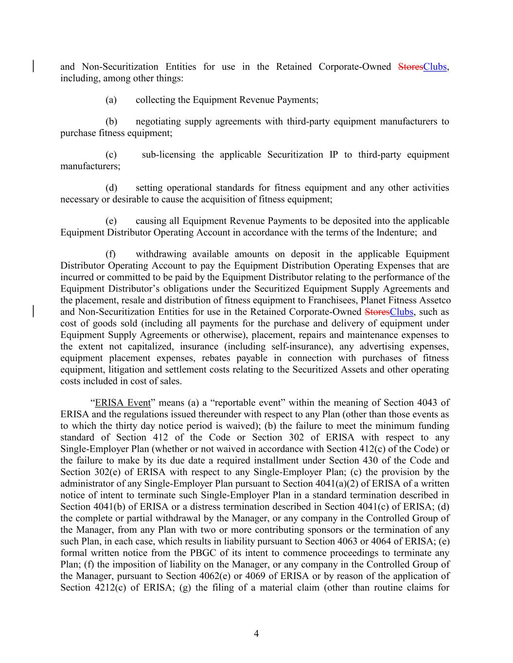 and Non-Securitization Entities for use in the Retained Corporate-Owned StoresClubs, including, among other things: (a) collecting the Equipment Revenue Payments; (b) negotiating supply agreements with third-party equipment manufacturers to purchase fitness equipment; (c) sub-licensing the applicable Securitization IP to third-party equipment manufacturers; (d) setting operational standards for fitness equipment and any other activities necessary or desirable to cause the acquisition of fitness equipment; (e) causing all Equipment Revenue Payments to be deposited into the applicable Equipment Distributor Operating Account in accordance with the terms of the Indenture; and (f) withdrawing available amounts on deposit in the applicable Equipment Distributor Operating Account to pay the Equipment Distribution Operating Expenses that are incurred or committed to be paid by the Equipment Distributor relating to the performance of the Equipment Distributor’s obligations under the Securitized Equipment Supply Agreements and the placement, resale and distribution of fitness equipment to Franchisees, Planet Fitness Assetco and Non-Securitization Entities for use in the Retained Corporate-Owned StoresClubs, such as cost of goods sold (including all payments for the purchase and delivery of equipment under Equipment Supply Agreements or otherwise), placement, repairs and maintenance expenses to the extent not capitalized, insurance (including self-insurance), any advertising expenses, equipment placement expenses, rebates payable in connection with purchases of fitness equipment, litigation and settlement costs relating to the Securitized Assets and other operating costs included in cost of sales. “ERISA Event” means (a) a “reportable event” within the meaning of Section 4043 of ERISA and the regulations issued thereunder with respect to any Plan (other than those events as to which the thirty day notice period is waived); (b) the failure to meet the minimum funding standard of Section 412 of the Code or Section 302 of ERISA with respect to any Single-Employer Plan (whether or not waived in accordance with Section 412(c) of the Code) or the failure to make by its due date a required installment under Section 430 of the Code and Section 302(e) of ERISA with respect to any Single-Employer Plan; (c) the provision by the administrator of any Single-Employer Plan pursuant to Section 4041(a)(2) of ERISA of a written notice of intent to terminate such Single-Employer Plan in a standard termination described in Section 4041(b) of ERISA or a distress termination described in Section 4041(c) of ERISA; (d) the complete or partial withdrawal by the Manager, or any company in the Controlled Group of the Manager, from any Plan with two or more contributing sponsors or the termination of any such Plan, in each case, which results in liability pursuant to Section 4063 or 4064 of ERISA; (e) formal written notice from the PBGC of its intent to commence proceedings to terminate any Plan; (f) the imposition of liability on the Manager, or any company in the Controlled Group of the Manager, pursuant to Section 4062(e) or 4069 of ERISA or by reason of the application of Section 4212(c) of ERISA; (g) the filing of a material claim (other than routine claims for 4