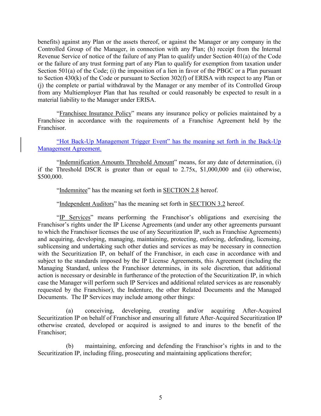 benefits) against any Plan or the assets thereof, or against the Manager or any company in the Controlled Group of the Manager, in connection with any Plan; (h) receipt from the Internal Revenue Service of notice of the failure of any Plan to qualify under Section 401(a) of the Code or the failure of any trust forming part of any Plan to qualify for exemption from taxation under Section 501(a) of the Code; (i) the imposition of a lien in favor of the PBGC or a Plan pursuant to Section 430(k) of the Code or pursuant to Section 302(f) of ERISA with respect to any Plan or (j) the complete or partial withdrawal by the Manager or any member of its Controlled Group from any Multiemployer Plan that has resulted or could reasonably be expected to result in a material liability to the Manager under ERISA. “Franchisee Insurance Policy” means any insurance policy or policies maintained by a Franchisee in accordance with the requirements of a Franchise Agreement held by the Franchisor. “Hot Back-Up Management Trigger Event” has the meaning set forth in the Back-Up Management Agreement. “Indemnification Amounts Threshold Amount” means, for any date of determination, (i) if the Threshold DSCR is greater than or equal to 2.75x, $1,000,000 and (ii) otherwise, $500,000. “Indemnitee” has the meaning set forth in SECTION 2.8 hereof. “Independent Auditors” has the meaning set forth in SECTION 3.2 hereof. “IP Services” means performing the Franchisor’s obligations and exercising the Franchisor’s rights under the IP License Agreements (and under any other agreements pursuant to which the Franchisor licenses the use of any Securitization IP, such as Franchise Agreements) and acquiring, developing, managing, maintaining, protecting, enforcing, defending, licensing, sublicensing and undertaking such other duties and services as may be necessary in connection with the Securitization IP, on behalf of the Franchisor, in each case in accordance with and subject to the standards imposed by the IP License Agreements, this Agreement (including the Managing Standard, unless the Franchisor determines, in its sole discretion, that additional action is necessary or desirable in furtherance of the protection of the Securitization IP, in which case the Manager will perform such IP Services and additional related services as are reasonably requested by the Franchisor), the Indenture, the other Related Documents and the Managed Documents. The IP Services may include among other things: (a) conceiving, developing, creating and/or acquiring After-Acquired Securitization IP on behalf of Franchisor and ensuring all future After-Acquired Securitization IP otherwise created, developed or acquired is assigned to and inures to the benefit of the Franchisor; (b) maintaining, enforcing and defending the Franchisor’s rights in and to the Securitization IP, including filing, prosecuting and maintaining applications therefor; 5