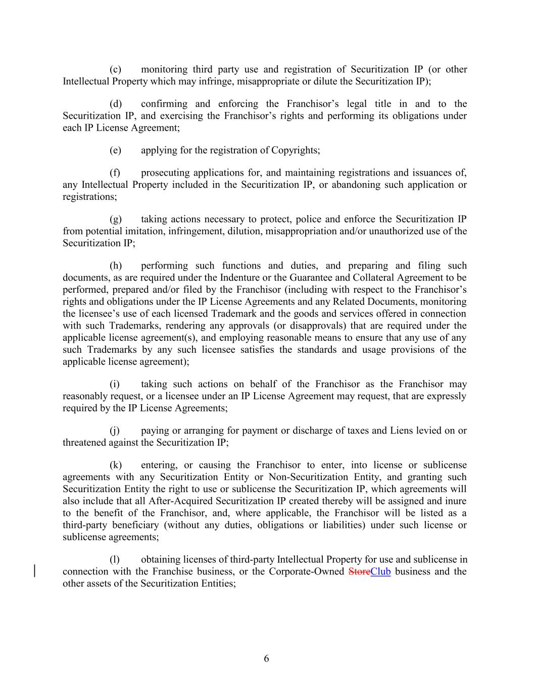 (c) monitoring third party use and registration of Securitization IP (or other Intellectual Property which may infringe, misappropriate or dilute the Securitization IP); (d) confirming and enforcing the Franchisor’s legal title in and to the Securitization IP, and exercising the Franchisor’s rights and performing its obligations under each IP License Agreement; (e) applying for the registration of Copyrights; (f) prosecuting applications for, and maintaining registrations and issuances of, any Intellectual Property included in the Securitization IP, or abandoning such application or registrations; (g) taking actions necessary to protect, police and enforce the Securitization IP from potential imitation, infringement, dilution, misappropriation and/or unauthorized use of the Securitization IP; (h) performing such functions and duties, and preparing and filing such documents, as are required under the Indenture or the Guarantee and Collateral Agreement to be performed, prepared and/or filed by the Franchisor (including with respect to the Franchisor’s rights and obligations under the IP License Agreements and any Related Documents, monitoring the licensee’s use of each licensed Trademark and the goods and services offered in connection with such Trademarks, rendering any approvals (or disapprovals) that are required under the applicable license agreement(s), and employing reasonable means to ensure that any use of any such Trademarks by any such licensee satisfies the standards and usage provisions of the applicable license agreement); (i) taking such actions on behalf of the Franchisor as the Franchisor may reasonably request, or a licensee under an IP License Agreement may request, that are expressly required by the IP License Agreements; (j) paying or arranging for payment or discharge of taxes and Liens levied on or threatened against the Securitization IP; (k) entering, or causing the Franchisor to enter, into license or sublicense agreements with any Securitization Entity or Non-Securitization Entity, and granting such Securitization Entity the right to use or sublicense the Securitization IP, which agreements will also include that all After-Acquired Securitization IP created thereby will be assigned and inure to the benefit of the Franchisor, and, where applicable, the Franchisor will be listed as a third-party beneficiary (without any duties, obligations or liabilities) under such license or sublicense agreements; (l) obtaining licenses of third-party Intellectual Property for use and sublicense in connection with the Franchise business, or the Corporate-Owned StoreClub business and the other assets of the Securitization Entities; 6