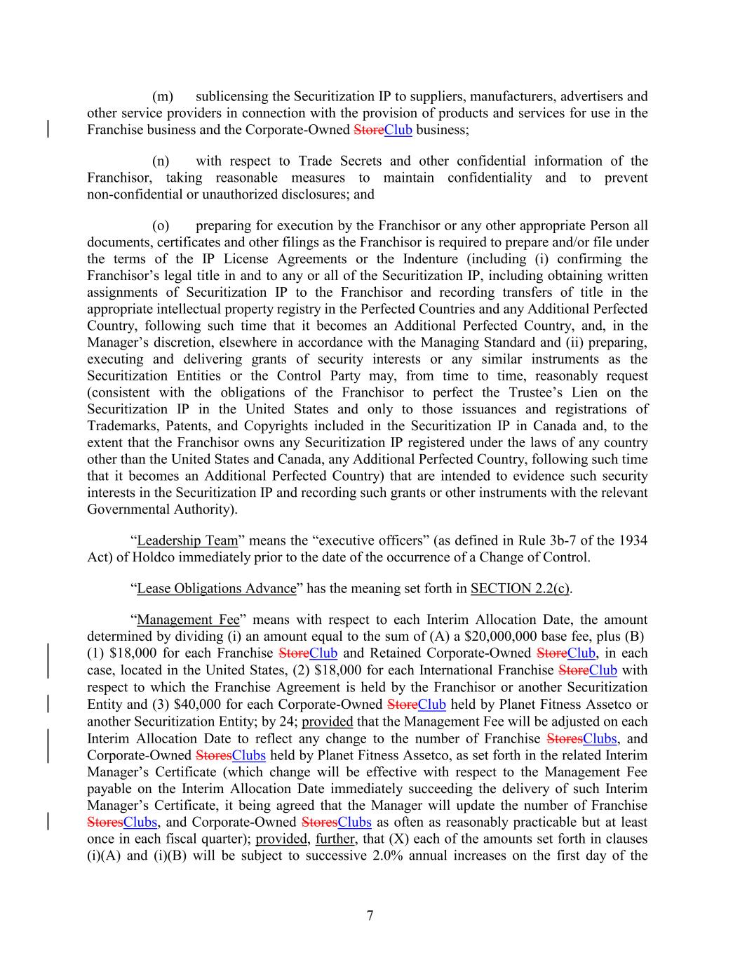 (m) sublicensing the Securitization IP to suppliers, manufacturers, advertisers and other service providers in connection with the provision of products and services for use in the Franchise business and the Corporate-Owned StoreClub business; (n) with respect to Trade Secrets and other confidential information of the Franchisor, taking reasonable measures to maintain confidentiality and to prevent non-confidential or unauthorized disclosures; and (o) preparing for execution by the Franchisor or any other appropriate Person all documents, certificates and other filings as the Franchisor is required to prepare and/or file under the terms of the IP License Agreements or the Indenture (including (i) confirming the Franchisor’s legal title in and to any or all of the Securitization IP, including obtaining written assignments of Securitization IP to the Franchisor and recording transfers of title in the appropriate intellectual property registry in the Perfected Countries and any Additional Perfected Country, following such time that it becomes an Additional Perfected Country, and, in the Manager’s discretion, elsewhere in accordance with the Managing Standard and (ii) preparing, executing and delivering grants of security interests or any similar instruments as the Securitization Entities or the Control Party may, from time to time, reasonably request (consistent with the obligations of the Franchisor to perfect the Trustee’s Lien on the Securitization IP in the United States and only to those issuances and registrations of Trademarks, Patents, and Copyrights included in the Securitization IP in Canada and, to the extent that the Franchisor owns any Securitization IP registered under the laws of any country other than the United States and Canada, any Additional Perfected Country, following such time that it becomes an Additional Perfected Country) that are intended to evidence such security interests in the Securitization IP and recording such grants or other instruments with the relevant Governmental Authority). “Leadership Team” means the “executive officers” (as defined in Rule 3b-7 of the 1934 Act) of Holdco immediately prior to the date of the occurrence of a Change of Control. “Lease Obligations Advance” has the meaning set forth in SECTION 2.2(c). “Management Fee” means with respect to each Interim Allocation Date, the amount determined by dividing (i) an amount equal to the sum of (A) a $20,000,000 base fee, plus (B) (1) $18,000 for each Franchise StoreClub and Retained Corporate-Owned StoreClub, in each case, located in the United States, (2) $18,000 for each International Franchise StoreClub with respect to which the Franchise Agreement is held by the Franchisor or another Securitization Entity and (3) $40,000 for each Corporate-Owned StoreClub held by Planet Fitness Assetco or another Securitization Entity; by 24; provided that the Management Fee will be adjusted on each Interim Allocation Date to reflect any change to the number of Franchise StoresClubs, and Corporate-Owned StoresClubs held by Planet Fitness Assetco, as set forth in the related Interim Manager’s Certificate (which change will be effective with respect to the Management Fee payable on the Interim Allocation Date immediately succeeding the delivery of such Interim Manager’s Certificate, it being agreed that the Manager will update the number of Franchise StoresClubs, and Corporate-Owned StoresClubs as often as reasonably practicable but at least once in each fiscal quarter); provided, further, that (X) each of the amounts set forth in clauses (i)(A) and (i)(B) will be subject to successive 2.0% annual increases on the first day of the 7