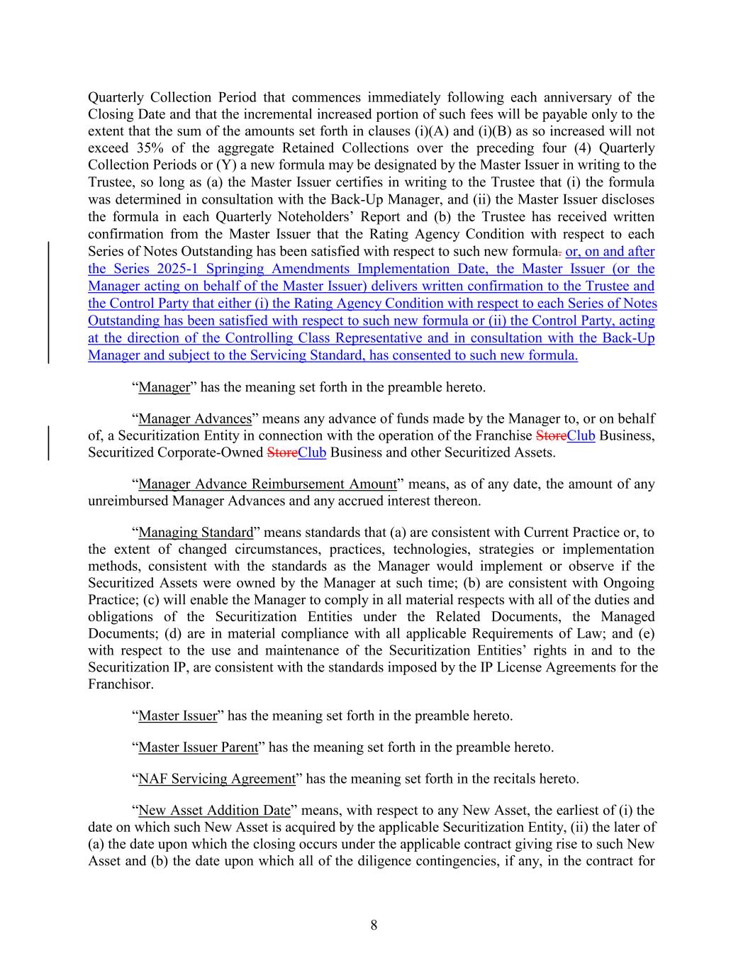 Quarterly Collection Period that commences immediately following each anniversary of the Closing Date and that the incremental increased portion of such fees will be payable only to the extent that the sum of the amounts set forth in clauses (i)(A) and (i)(B) as so increased will not exceed 35% of the aggregate Retained Collections over the preceding four (4) Quarterly Collection Periods or (Y) a new formula may be designated by the Master Issuer in writing to the Trustee, so long as (a) the Master Issuer certifies in writing to the Trustee that (i) the formula was determined in consultation with the Back-Up Manager, and (ii) the Master Issuer discloses the formula in each Quarterly Noteholders’ Report and (b) the Trustee has received written confirmation from the Master Issuer that the Rating Agency Condition with respect to each Series of Notes Outstanding has been satisfied with respect to such new formula. or, on and after the Series 2025-1 Springing Amendments Implementation Date, the Master Issuer (or the Manager acting on behalf of the Master Issuer) delivers written confirmation to the Trustee and the Control Party that either (i) the Rating Agency Condition with respect to each Series of Notes Outstanding has been satisfied with respect to such new formula or (ii) the Control Party, acting at the direction of the Controlling Class Representative and in consultation with the Back-Up Manager and subject to the Servicing Standard, has consented to such new formula. “Manager” has the meaning set forth in the preamble hereto. “Manager Advances” means any advance of funds made by the Manager to, or on behalf of, a Securitization Entity in connection with the operation of the Franchise StoreClub Business, Securitized Corporate-Owned StoreClub Business and other Securitized Assets. “Manager Advance Reimbursement Amount” means, as of any date, the amount of any unreimbursed Manager Advances and any accrued interest thereon. “Managing Standard” means standards that (a) are consistent with Current Practice or, to the extent of changed circumstances, practices, technologies, strategies or implementation methods, consistent with the standards as the Manager would implement or observe if the Securitized Assets were owned by the Manager at such time; (b) are consistent with Ongoing Practice; (c) will enable the Manager to comply in all material respects with all of the duties and obligations of the Securitization Entities under the Related Documents, the Managed Documents; (d) are in material compliance with all applicable Requirements of Law; and (e) with respect to the use and maintenance of the Securitization Entities’ rights in and to the Securitization IP, are consistent with the standards imposed by the IP License Agreements for the Franchisor. “Master Issuer” has the meaning set forth in the preamble hereto. “Master Issuer Parent” has the meaning set forth in the preamble hereto. “NAF Servicing Agreement” has the meaning set forth in the recitals hereto. “New Asset Addition Date” means, with respect to any New Asset, the earliest of (i) the date on which such New Asset is acquired by the applicable Securitization Entity, (ii) the later of (a) the date upon which the closing occurs under the applicable contract giving rise to such New Asset and (b) the date upon which all of the diligence contingencies, if any, in the contract for 8