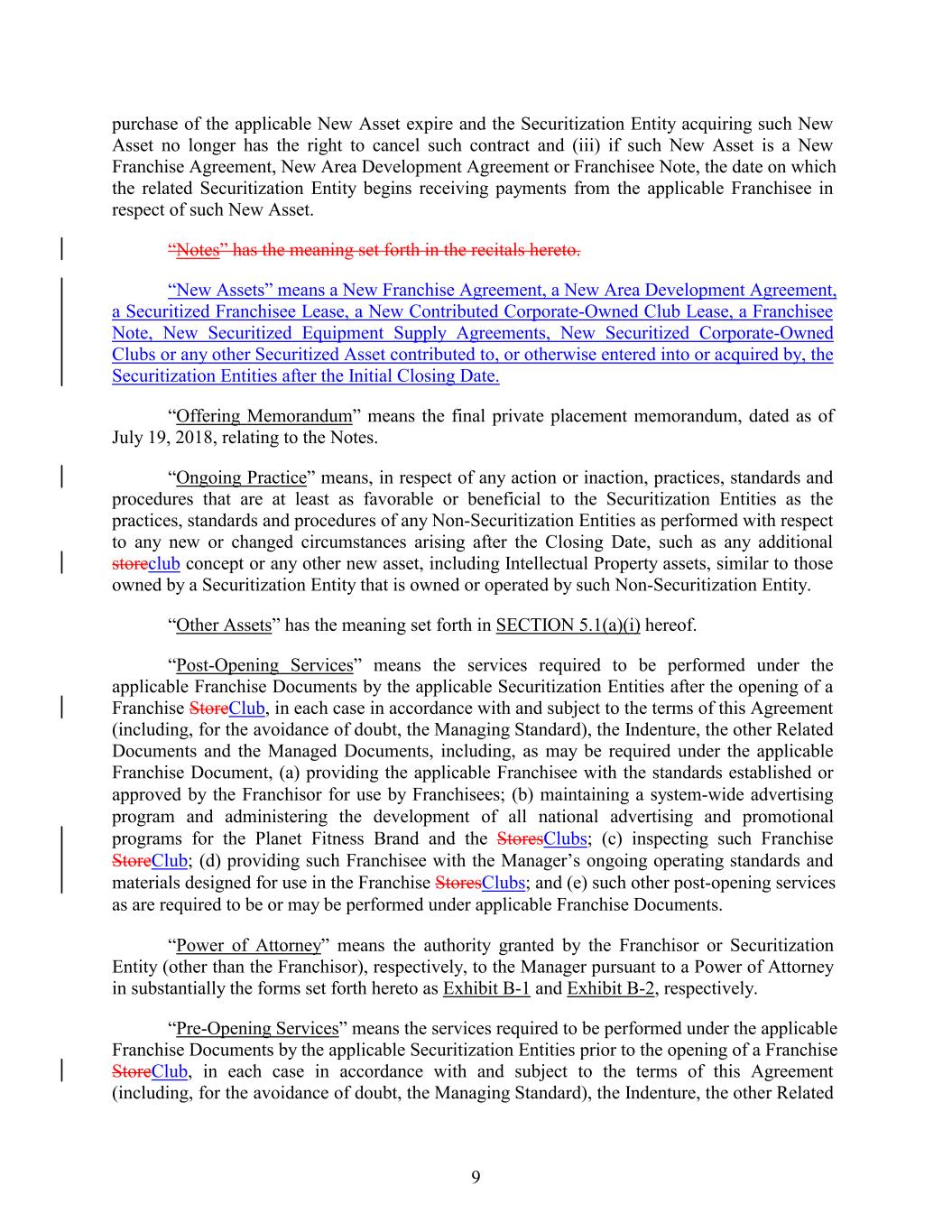 purchase of the applicable New Asset expire and the Securitization Entity acquiring such New Asset no longer has the right to cancel such contract and (iii) if such New Asset is a New Franchise Agreement, New Area Development Agreement or Franchisee Note, the date on which the related Securitization Entity begins receiving payments from the applicable Franchisee in respect of such New Asset. “Notes” has the meaning set forth in the recitals hereto. “New Assets” means a New Franchise Agreement, a New Area Development Agreement, a Securitized Franchisee Lease, a New Contributed Corporate-Owned Club Lease, a Franchisee Note, New Securitized Equipment Supply Agreements, New Securitized Corporate-Owned Clubs or any other Securitized Asset contributed to, or otherwise entered into or acquired by, the Securitization Entities after the Initial Closing Date. “Offering Memorandum” means the final private placement memorandum, dated as of July 19, 2018, relating to the Notes. “Ongoing Practice” means, in respect of any action or inaction, practices, standards and procedures that are at least as favorable or beneficial to the Securitization Entities as the practices, standards and procedures of any Non-Securitization Entities as performed with respect to any new or changed circumstances arising after the Closing Date, such as any additional storeclub concept or any other new asset, including Intellectual Property assets, similar to those owned by a Securitization Entity that is owned or operated by such Non-Securitization Entity. “Other Assets” has the meaning set forth in SECTION 5.1(a)(i) hereof. “Post-Opening Services” means the services required to be performed under the applicable Franchise Documents by the applicable Securitization Entities after the opening of a Franchise StoreClub, in each case in accordance with and subject to the terms of this Agreement (including, for the avoidance of doubt, the Managing Standard), the Indenture, the other Related Documents and the Managed Documents, including, as may be required under the applicable Franchise Document, (a) providing the applicable Franchisee with the standards established or approved by the Franchisor for use by Franchisees; (b) maintaining a system-wide advertising program and administering the development of all national advertising and promotional programs for the Planet Fitness Brand and the StoresClubs; (c) inspecting such Franchise StoreClub; (d) providing such Franchisee with the Manager’s ongoing operating standards and materials designed for use in the Franchise StoresClubs; and (e) such other post-opening services as are required to be or may be performed under applicable Franchise Documents. “Power of Attorney” means the authority granted by the Franchisor or Securitization Entity (other than the Franchisor), respectively, to the Manager pursuant to a Power of Attorney in substantially the forms set forth hereto as Exhibit B-1 and Exhibit B-2, respectively. “Pre-Opening Services” means the services required to be performed under the applicable Franchise Documents by the applicable Securitization Entities prior to the opening of a Franchise StoreClub, in each case in accordance with and subject to the terms of this Agreement (including, for the avoidance of doubt, the Managing Standard), the Indenture, the other Related 9