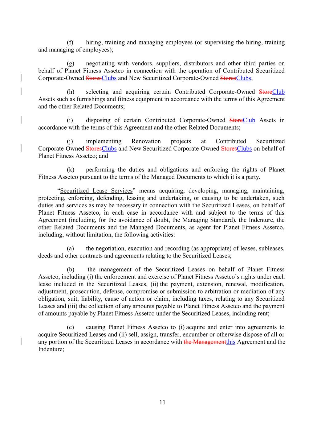 (f) hiring, training and managing employees (or supervising the hiring, training and managing of employees); (g) negotiating with vendors, suppliers, distributors and other third parties on behalf of Planet Fitness Assetco in connection with the operation of Contributed Securitized Corporate-Owned StoresClubs and New Securitized Corporate-Owned StoresClubs; (h) selecting and acquiring certain Contributed Corporate-Owned StoreClub Assets such as furnishings and fitness equipment in accordance with the terms of this Agreement and the other Related Documents; (i) disposing of certain Contributed Corporate-Owned StoreClub Assets in accordance with the terms of this Agreement and the other Related Documents; (j) implementing Renovation projects at Contributed Securitized Corporate-Owned StoresClubs and New Securitized Corporate-Owned StoresClubs on behalf of Planet Fitness Assetco; and (k) performing the duties and obligations and enforcing the rights of Planet Fitness Assetco pursuant to the terms of the Managed Documents to which it is a party. “Securitized Lease Services” means acquiring, developing, managing, maintaining, protecting, enforcing, defending, leasing and undertaking, or causing to be undertaken, such duties and services as may be necessary in connection with the Securitized Leases, on behalf of Planet Fitness Assetco, in each case in accordance with and subject to the terms of this Agreement (including, for the avoidance of doubt, the Managing Standard), the Indenture, the other Related Documents and the Managed Documents, as agent for Planet Fitness Assetco, including, without limitation, the following activities: (a) the negotiation, execution and recording (as appropriate) of leases, subleases, deeds and other contracts and agreements relating to the Securitized Leases; (b) the management of the Securitized Leases on behalf of Planet Fitness Assetco, including (i) the enforcement and exercise of Planet Fitness Assetco’s rights under each lease included in the Securitized Leases, (ii) the payment, extension, renewal, modification, adjustment, prosecution, defense, compromise or submission to arbitration or mediation of any obligation, suit, liability, cause of action or claim, including taxes, relating to any Securitized Leases and (iii) the collection of any amounts payable to Planet Fitness Assetco and the payment of amounts payable by Planet Fitness Assetco under the Securitized Leases, including rent; (c) causing Planet Fitness Assetco to (i) acquire and enter into agreements to acquire Securitized Leases and (ii) sell, assign, transfer, encumber or otherwise dispose of all or any portion of the Securitized Leases in accordance with the Managementthis Agreement and the Indenture; 11