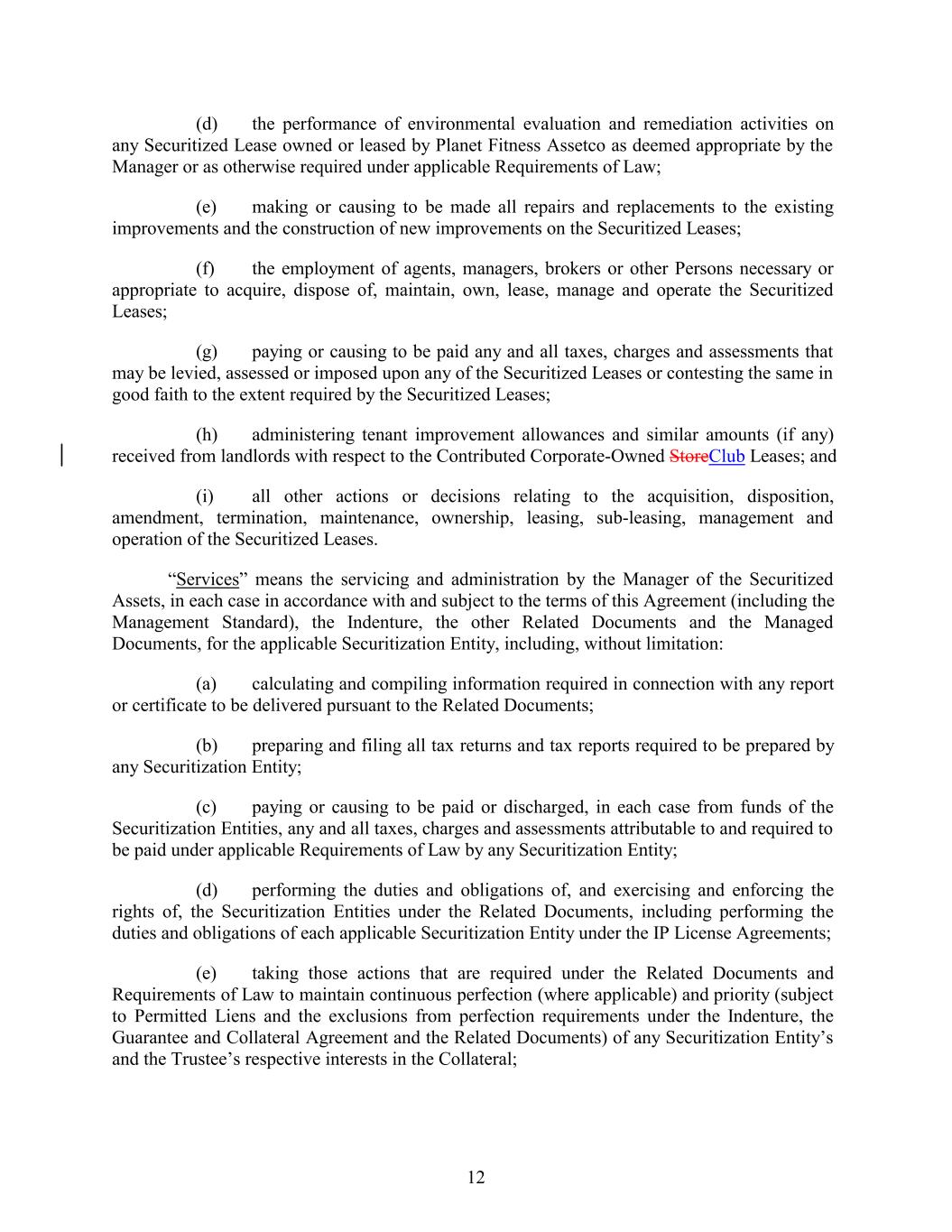 (d) the performance of environmental evaluation and remediation activities on any Securitized Lease owned or leased by Planet Fitness Assetco as deemed appropriate by the Manager or as otherwise required under applicable Requirements of Law; (e) making or causing to be made all repairs and replacements to the existing improvements and the construction of new improvements on the Securitized Leases; (f) the employment of agents, managers, brokers or other Persons necessary or appropriate to acquire, dispose of, maintain, own, lease, manage and operate the Securitized Leases; (g) paying or causing to be paid any and all taxes, charges and assessments that may be levied, assessed or imposed upon any of the Securitized Leases or contesting the same in good faith to the extent required by the Securitized Leases; (h) administering tenant improvement allowances and similar amounts (if any) received from landlords with respect to the Contributed Corporate-Owned StoreClub Leases; and (i) all other actions or decisions relating to the acquisition, disposition, amendment, termination, maintenance, ownership, leasing, sub-leasing, management and operation of the Securitized Leases. “Services” means the servicing and administration by the Manager of the Securitized Assets, in each case in accordance with and subject to the terms of this Agreement (including the Management Standard), the Indenture, the other Related Documents and the Managed Documents, for the applicable Securitization Entity, including, without limitation: (a) calculating and compiling information required in connection with any report or certificate to be delivered pursuant to the Related Documents; (b) preparing and filing all tax returns and tax reports required to be prepared by any Securitization Entity; (c) paying or causing to be paid or discharged, in each case from funds of the Securitization Entities, any and all taxes, charges and assessments attributable to and required to be paid under applicable Requirements of Law by any Securitization Entity; (d) performing the duties and obligations of, and exercising and enforcing the rights of, the Securitization Entities under the Related Documents, including performing the duties and obligations of each applicable Securitization Entity under the IP License Agreements; (e) taking those actions that are required under the Related Documents and Requirements of Law to maintain continuous perfection (where applicable) and priority (subject to Permitted Liens and the exclusions from perfection requirements under the Indenture, the Guarantee and Collateral Agreement and the Related Documents) of any Securitization Entity’s and the Trustee’s respective interests in the Collateral; 12