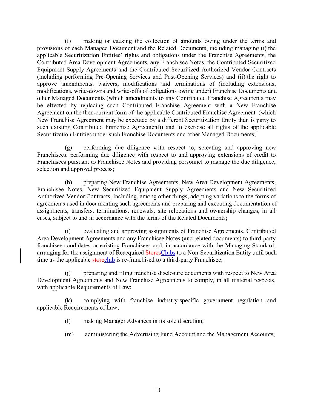 (f) making or causing the collection of amounts owing under the terms and provisions of each Managed Document and the Related Documents, including managing (i) the applicable Securitization Entities’ rights and obligations under the Franchise Agreements, the Contributed Area Development Agreements, any Franchisee Notes, the Contributed Securitized Equipment Supply Agreements and the Contributed Securitized Authorized Vendor Contracts (including performing Pre-Opening Services and Post-Opening Services) and (ii) the right to approve amendments, waivers, modifications and terminations of (including extensions, modifications, write-downs and write-offs of obligations owing under) Franchise Documents and other Managed Documents (which amendments to any Contributed Franchise Agreements may be effected by replacing such Contributed Franchise Agreement with a New Franchise Agreement on the then-current form of the applicable Contributed Franchise Agreement (which New Franchise Agreement may be executed by a different Securitization Entity than is party to such existing Contributed Franchise Agreement)) and to exercise all rights of the applicable Securitization Entities under such Franchise Documents and other Managed Documents; (g) performing due diligence with respect to, selecting and approving new Franchisees, performing due diligence with respect to and approving extensions of credit to Franchisees pursuant to Franchisee Notes and providing personnel to manage the due diligence, selection and approval process; (h) preparing New Franchise Agreements, New Area Development Agreements, Franchisee Notes, New Securitized Equipment Supply Agreements and New Securitized Authorized Vendor Contracts, including, among other things, adopting variations to the forms of agreements used in documenting such agreements and preparing and executing documentation of assignments, transfers, terminations, renewals, site relocations and ownership changes, in all cases, subject to and in accordance with the terms of the Related Documents; (i) evaluating and approving assignments of Franchise Agreements, Contributed Area Development Agreements and any Franchisee Notes (and related documents) to third-party franchisee candidates or existing Franchisees and, in accordance with the Managing Standard, arranging for the assignment of Reacquired StoresClubs to a Non-Securitization Entity until such time as the applicable storeclub is re-franchised to a third-party Franchisee; (j) preparing and filing franchise disclosure documents with respect to New Area Development Agreements and New Franchise Agreements to comply, in all material respects, with applicable Requirements of Law; (k) complying with franchise industry-specific government regulation and applicable Requirements of Law; (l) making Manager Advances in its sole discretion; (m) administering the Advertising Fund Account and the Management Accounts; 13