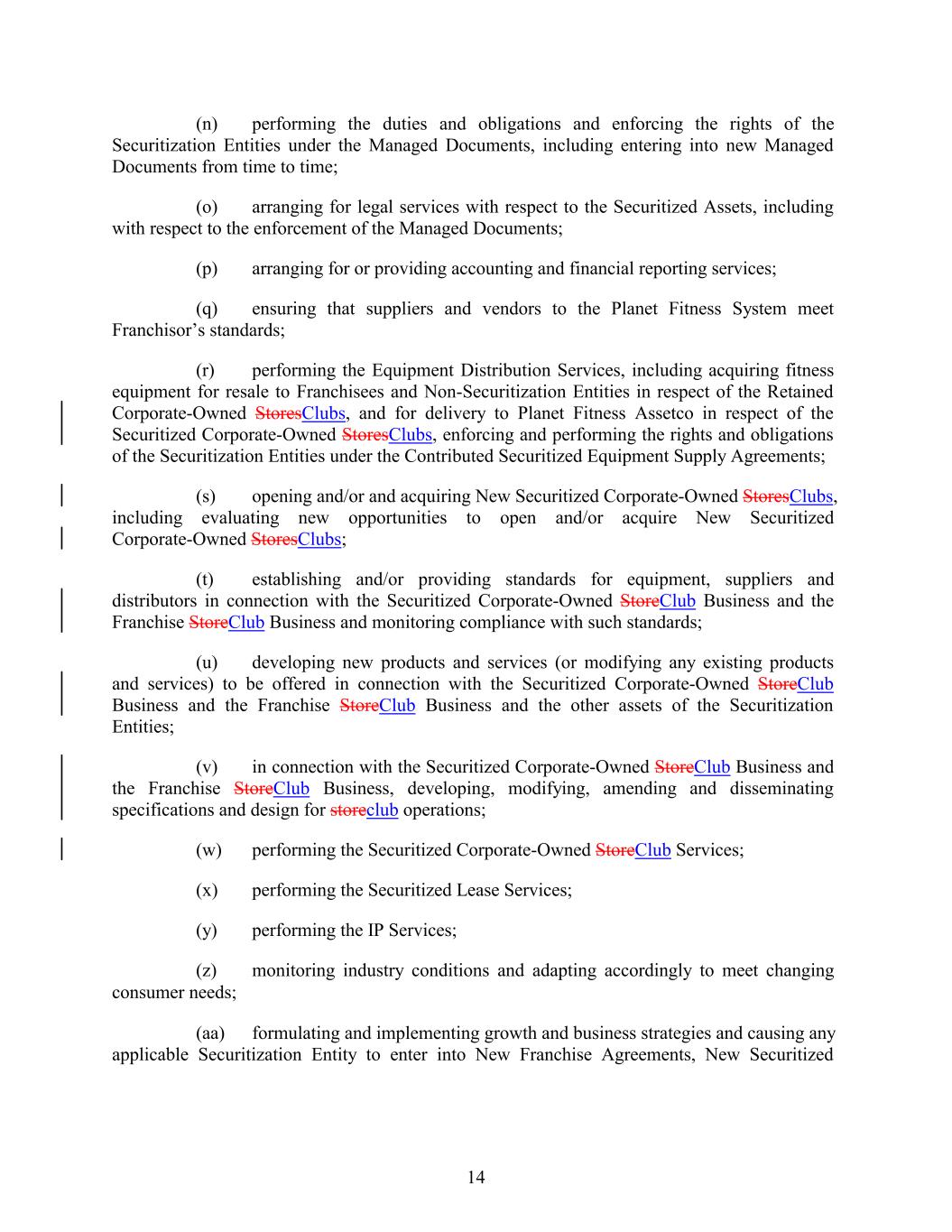 (n) performing the duties and obligations and enforcing the rights of the Securitization Entities under the Managed Documents, including entering into new Managed Documents from time to time; (o) arranging for legal services with respect to the Securitized Assets, including with respect to the enforcement of the Managed Documents; (p) arranging for or providing accounting and financial reporting services; (q) ensuring that suppliers and vendors to the Planet Fitness System meet Franchisor’s standards; (r) performing the Equipment Distribution Services, including acquiring fitness equipment for resale to Franchisees and Non-Securitization Entities in respect of the Retained Corporate-Owned StoresClubs, and for delivery to Planet Fitness Assetco in respect of the Securitized Corporate-Owned StoresClubs, enforcing and performing the rights and obligations of the Securitization Entities under the Contributed Securitized Equipment Supply Agreements; (s) opening and/or and acquiring New Securitized Corporate-Owned StoresClubs, including evaluating new opportunities to open and/or acquire New Securitized Corporate-Owned StoresClubs; (t) establishing and/or providing standards for equipment, suppliers and distributors in connection with the Securitized Corporate-Owned StoreClub Business and the Franchise StoreClub Business and monitoring compliance with such standards; (u) developing new products and services (or modifying any existing products and services) to be offered in connection with the Securitized Corporate-Owned StoreClub Business and the Franchise StoreClub Business and the other assets of the Securitization Entities; (v) in connection with the Securitized Corporate-Owned StoreClub Business and the Franchise StoreClub Business, developing, modifying, amending and disseminating specifications and design for storeclub operations; (w) performing the Securitized Corporate-Owned StoreClub Services; (x) performing the Securitized Lease Services; (y) performing the IP Services; (z) monitoring industry conditions and adapting accordingly to meet changing consumer needs; (aa) formulating and implementing growth and business strategies and causing any applicable Securitization Entity to enter into New Franchise Agreements, New Securitized 14