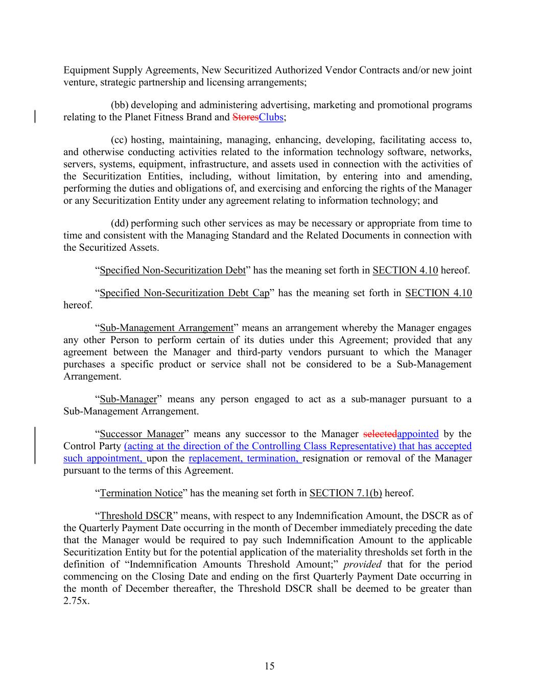 Equipment Supply Agreements, New Securitized Authorized Vendor Contracts and/or new joint venture, strategic partnership and licensing arrangements; (bb) developing and administering advertising, marketing and promotional programs relating to the Planet Fitness Brand and StoresClubs; (cc) hosting, maintaining, managing, enhancing, developing, facilitating access to, and otherwise conducting activities related to the information technology software, networks, servers, systems, equipment, infrastructure, and assets used in connection with the activities of the Securitization Entities, including, without limitation, by entering into and amending, performing the duties and obligations of, and exercising and enforcing the rights of the Manager or any Securitization Entity under any agreement relating to information technology; and (dd) performing such other services as may be necessary or appropriate from time to time and consistent with the Managing Standard and the Related Documents in connection with the Securitized Assets. “Specified Non-Securitization Debt” has the meaning set forth in SECTION 4.10 hereof. “Specified Non-Securitization Debt Cap” has the meaning set forth in SECTION 4.10 hereof. “Sub-Management Arrangement” means an arrangement whereby the Manager engages any other Person to perform certain of its duties under this Agreement; provided that any agreement between the Manager and third-party vendors pursuant to which the Manager purchases a specific product or service shall not be considered to be a Sub-Management Arrangement. “Sub-Manager” means any person engaged to act as a sub-manager pursuant to a Sub-Management Arrangement. “Successor Manager” means any successor to the Manager selectedappointed by the Control Party (acting at the direction of the Controlling Class Representative) that has accepted such appointment, upon the replacement, termination, resignation or removal of the Manager pursuant to the terms of this Agreement. “Termination Notice” has the meaning set forth in SECTION 7.1(b) hereof. “Threshold DSCR” means, with respect to any Indemnification Amount, the DSCR as of the Quarterly Payment Date occurring in the month of December immediately preceding the date that the Manager would be required to pay such Indemnification Amount to the applicable Securitization Entity but for the potential application of the materiality thresholds set forth in the definition of “Indemnification Amounts Threshold Amount;” provided that for the period commencing on the Closing Date and ending on the first Quarterly Payment Date occurring in the month of December thereafter, the Threshold DSCR shall be deemed to be greater than 2.75x. 15