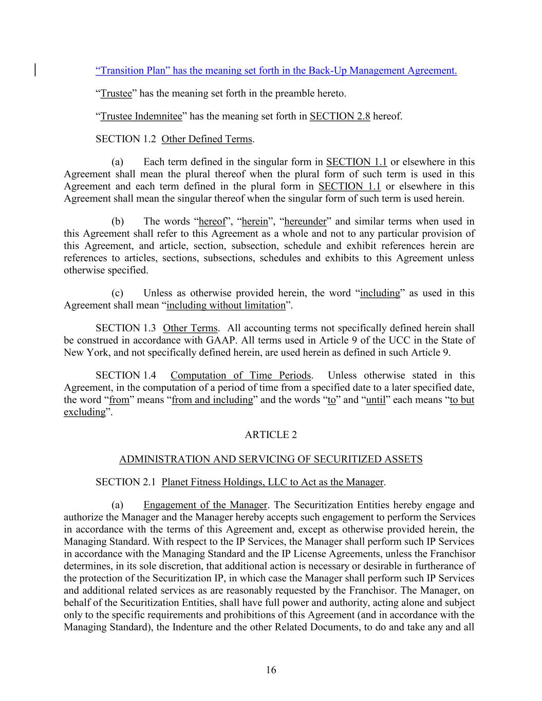 “Transition Plan” has the meaning set forth in the Back-Up Management Agreement. “Trustee” has the meaning set forth in the preamble hereto. “Trustee Indemnitee” has the meaning set forth in SECTION 2.8 hereof. SECTION 1.2 Other Defined Terms. (a) Each term defined in the singular form in SECTION 1.1 or elsewhere in this Agreement shall mean the plural thereof when the plural form of such term is used in this Agreement and each term defined in the plural form in SECTION 1.1 or elsewhere in this Agreement shall mean the singular thereof when the singular form of such term is used herein. (b) The words “hereof”, “herein”, “hereunder” and similar terms when used in this Agreement shall refer to this Agreement as a whole and not to any particular provision of this Agreement, and article, section, subsection, schedule and exhibit references herein are references to articles, sections, subsections, schedules and exhibits to this Agreement unless otherwise specified. (c) Unless as otherwise provided herein, the word “including” as used in this Agreement shall mean “including without limitation”. SECTION 1.3 Other Terms. All accounting terms not specifically defined herein shall be construed in accordance with GAAP. All terms used in Article 9 of the UCC in the State of New York, and not specifically defined herein, are used herein as defined in such Article 9. SECTION 1.4 Computation of Time Periods. Unless otherwise stated in this Agreement, in the computation of a period of time from a specified date to a later specified date, the word “from” means “from and including” and the words “to” and “until” each means “to but excluding”. ARTICLE 2 ADMINISTRATION AND SERVICING OF SECURITIZED ASSETS SECTION 2.1 Planet Fitness Holdings, LLC to Act as the Manager. (a) Engagement of the Manager. The Securitization Entities hereby engage and authorize the Manager and the Manager hereby accepts such engagement to perform the Services in accordance with the terms of this Agreement and, except as otherwise provided herein, the Managing Standard. With respect to the IP Services, the Manager shall perform such IP Services in accordance with the Managing Standard and the IP License Agreements, unless the Franchisor determines, in its sole discretion, that additional action is necessary or desirable in furtherance of the protection of the Securitization IP, in which case the Manager shall perform such IP Services and additional related services as are reasonably requested by the Franchisor. The Manager, on behalf of the Securitization Entities, shall have full power and authority, acting alone and subject only to the specific requirements and prohibitions of this Agreement (and in accordance with the Managing Standard), the Indenture and the other Related Documents, to do and take any and all 16