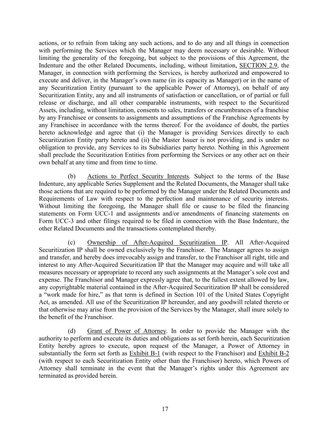 actions, or to refrain from taking any such actions, and to do any and all things in connection with performing the Services which the Manager may deem necessary or desirable. Without limiting the generality of the foregoing, but subject to the provisions of this Agreement, the Indenture and the other Related Documents, including, without limitation, SECTION 2.9, the Manager, in connection with performing the Services, is hereby authorized and empowered to execute and deliver, in the Manager’s own name (in its capacity as Manager) or in the name of any Securitization Entity (pursuant to the applicable Power of Attorney), on behalf of any Securitization Entity, any and all instruments of satisfaction or cancellation, or of partial or full release or discharge, and all other comparable instruments, with respect to the Securitized Assets, including, without limitation, consents to sales, transfers or encumbrances of a franchise by any Franchisee or consents to assignments and assumptions of the Franchise Agreements by any Franchisee in accordance with the terms thereof. For the avoidance of doubt, the parties hereto acknowledge and agree that (i) the Manager is providing Services directly to each Securitization Entity party hereto and (ii) the Master Issuer is not providing, and is under no obligation to provide, any Services to its Subsidiaries party hereto. Nothing in this Agreement shall preclude the Securitization Entities from performing the Services or any other act on their own behalf at any time and from time to time. (b) Actions to Perfect Security Interests. Subject to the terms of the Base Indenture, any applicable Series Supplement and the Related Documents, the Manager shall take those actions that are required to be performed by the Manager under the Related Documents and Requirements of Law with respect to the perfection and maintenance of security interests. Without limiting the foregoing, the Manager shall file or cause to be filed the financing statements on Form UCC-1 and assignments and/or amendments of financing statements on Form UCC-3 and other filings required to be filed in connection with the Base Indenture, the other Related Documents and the transactions contemplated thereby. (c) Ownership of After-Acquired Securitization IP. All After-Acquired Securitization IP shall be owned exclusively by the Franchisor. The Manager agrees to assign and transfer, and hereby does irrevocably assign and transfer, to the Franchisor all right, title and interest to any After-Acquired Securitization IP that the Manager may acquire and will take all measures necessary or appropriate to record any such assignments at the Manager’s sole cost and expense. The Franchisor and Manager expressly agree that, to the fullest extent allowed by law, any copyrightable material contained in the After-Acquired Securitization IP shall be considered a “work made for hire,” as that term is defined in Section 101 of the United States Copyright Act, as amended. All use of the Securitization IP hereunder, and any goodwill related thereto or that otherwise may arise from the provision of the Services by the Manager, shall inure solely to the benefit of the Franchisor. (d) Grant of Power of Attorney. In order to provide the Manager with the authority to perform and execute its duties and obligations as set forth herein, each Securitization Entity hereby agrees to execute, upon request of the Manager, a Power of Attorney in substantially the form set forth as Exhibit B-1 (with respect to the Franchisor) and Exhibit B-2 (with respect to each Securitization Entity other than the Franchisor) hereto, which Powers of Attorney shall terminate in the event that the Manager’s rights under this Agreement are terminated as provided herein. 17