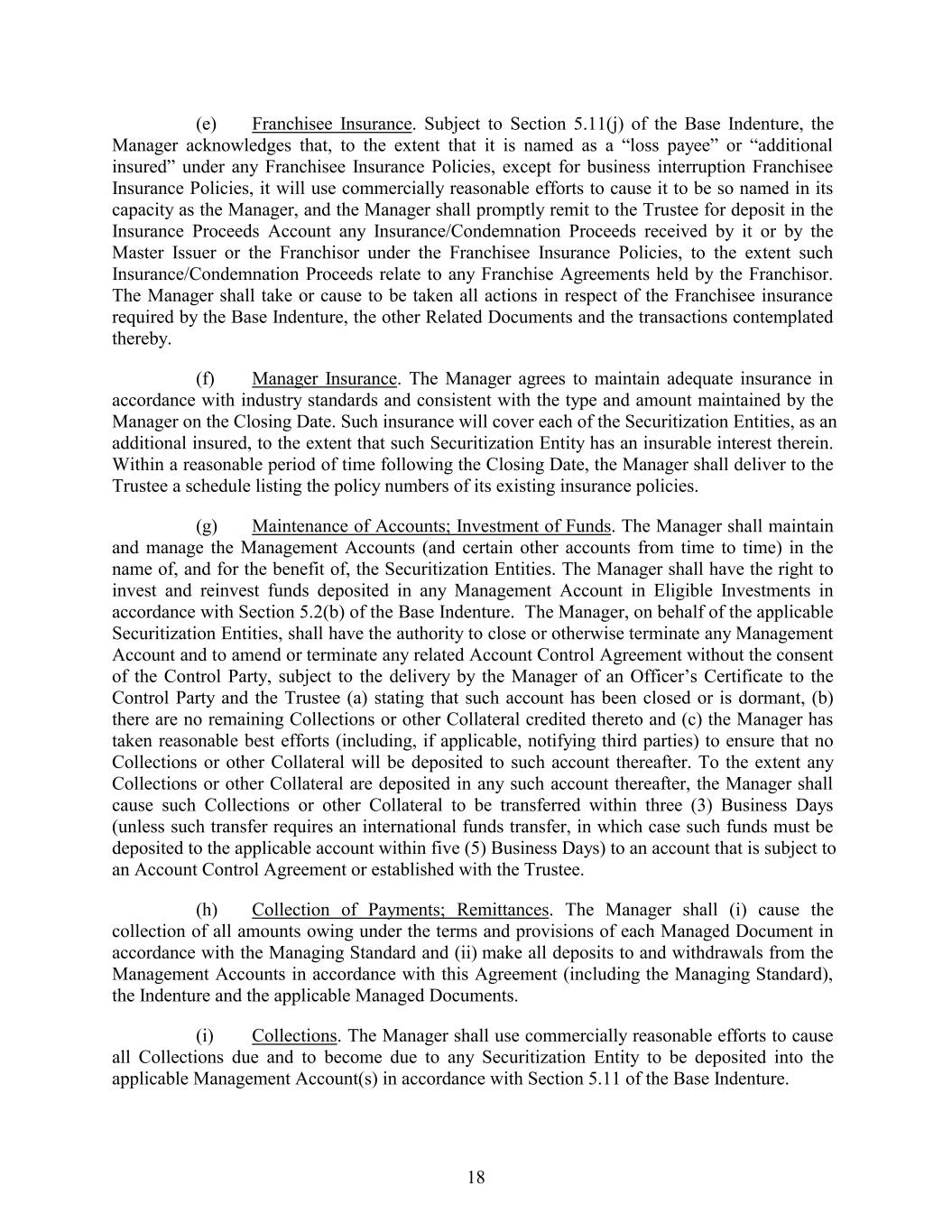 (e) Franchisee Insurance. Subject to Section 5.11(j) of the Base Indenture, the Manager acknowledges that, to the extent that it is named as a “loss payee” or “additional insured” under any Franchisee Insurance Policies, except for business interruption Franchisee Insurance Policies, it will use commercially reasonable efforts to cause it to be so named in its capacity as the Manager, and the Manager shall promptly remit to the Trustee for deposit in the Insurance Proceeds Account any Insurance/Condemnation Proceeds received by it or by the Master Issuer or the Franchisor under the Franchisee Insurance Policies, to the extent such Insurance/Condemnation Proceeds relate to any Franchise Agreements held by the Franchisor. The Manager shall take or cause to be taken all actions in respect of the Franchisee insurance required by the Base Indenture, the other Related Documents and the transactions contemplated thereby. (f) Manager Insurance. The Manager agrees to maintain adequate insurance in accordance with industry standards and consistent with the type and amount maintained by the Manager on the Closing Date. Such insurance will cover each of the Securitization Entities, as an additional insured, to the extent that such Securitization Entity has an insurable interest therein. Within a reasonable period of time following the Closing Date, the Manager shall deliver to the Trustee a schedule listing the policy numbers of its existing insurance policies. (g) Maintenance of Accounts; Investment of Funds. The Manager shall maintain and manage the Management Accounts (and certain other accounts from time to time) in the name of, and for the benefit of, the Securitization Entities. The Manager shall have the right to invest and reinvest funds deposited in any Management Account in Eligible Investments in accordance with Section 5.2(b) of the Base Indenture. The Manager, on behalf of the applicable Securitization Entities, shall have the authority to close or otherwise terminate any Management Account and to amend or terminate any related Account Control Agreement without the consent of the Control Party, subject to the delivery by the Manager of an Officer’s Certificate to the Control Party and the Trustee (a) stating that such account has been closed or is dormant, (b) there are no remaining Collections or other Collateral credited thereto and (c) the Manager has taken reasonable best efforts (including, if applicable, notifying third parties) to ensure that no Collections or other Collateral will be deposited to such account thereafter. To the extent any Collections or other Collateral are deposited in any such account thereafter, the Manager shall cause such Collections or other Collateral to be transferred within three (3) Business Days (unless such transfer requires an international funds transfer, in which case such funds must be deposited to the applicable account within five (5) Business Days) to an account that is subject to an Account Control Agreement or established with the Trustee. (h) Collection of Payments; Remittances. The Manager shall (i) cause the collection of all amounts owing under the terms and provisions of each Managed Document in accordance with the Managing Standard and (ii) make all deposits to and withdrawals from the Management Accounts in accordance with this Agreement (including the Managing Standard), the Indenture and the applicable Managed Documents. (i) Collections. The Manager shall use commercially reasonable efforts to cause all Collections due and to become due to any Securitization Entity to be deposited into the applicable Management Account(s) in accordance with Section 5.11 of the Base Indenture. 18