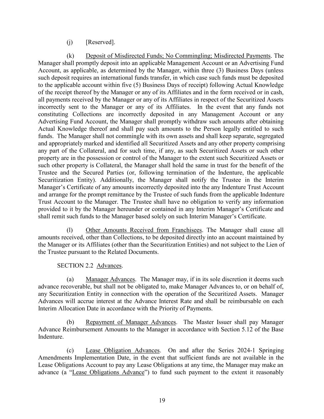 (j) [Reserved]. (k) Deposit of Misdirected Funds; No Commingling; Misdirected Payments. The Manager shall promptly deposit into an applicable Management Account or an Advertising Fund Account, as applicable, as determined by the Manager, within three (3) Business Days (unless such deposit requires an international funds transfer, in which case such funds must be deposited to the applicable account within five (5) Business Days of receipt) following Actual Knowledge of the receipt thereof by the Manager or any of its Affiliates and in the form received or in cash, all payments received by the Manager or any of its Affiliates in respect of the Securitized Assets incorrectly sent to the Manager or any of its Affiliates. In the event that any funds not constituting Collections are incorrectly deposited in any Management Account or any Advertising Fund Account, the Manager shall promptly withdraw such amounts after obtaining Actual Knowledge thereof and shall pay such amounts to the Person legally entitled to such funds. The Manager shall not commingle with its own assets and shall keep separate, segregated and appropriately marked and identified all Securitized Assets and any other property comprising any part of the Collateral, and for such time, if any, as such Securitized Assets or such other property are in the possession or control of the Manager to the extent such Securitized Assets or such other property is Collateral, the Manager shall hold the same in trust for the benefit of the Trustee and the Secured Parties (or, following termination of the Indenture, the applicable Securitization Entity). Additionally, the Manager shall notify the Trustee in the Interim Manager’s Certificate of any amounts incorrectly deposited into the any Indenture Trust Account and arrange for the prompt remittance by the Trustee of such funds from the applicable Indenture Trust Account to the Manager. The Trustee shall have no obligation to verify any information provided to it by the Manager hereunder or contained in any Interim Manager’s Certificate and shall remit such funds to the Manager based solely on such Interim Manager’s Certificate. (l) Other Amounts Received from Franchisees. The Manager shall cause all amounts received, other than Collections, to be deposited directly into an account maintained by the Manager or its Affiliates (other than the Securitization Entities) and not subject to the Lien of the Trustee pursuant to the Related Documents. SECTION 2.2 Advances. (a) Manager Advances. The Manager may, if in its sole discretion it deems such advance recoverable, but shall not be obligated to, make Manager Advances to, or on behalf of, any Securitization Entity in connection with the operation of the Securitized Assets. Manager Advances will accrue interest at the Advance Interest Rate and shall be reimbursable on each Interim Allocation Date in accordance with the Priority of Payments. (b) Repayment of Manager Advances. The Master Issuer shall pay Manager Advance Reimbursement Amounts to the Manager in accordance with Section 5.12 of the Base Indenture. (c) Lease Obligation Advances. On and after the Series 2024-1 Springing Amendments Implementation Date, in the event that sufficient funds are not available in the Lease Obligations Account to pay any Lease Obligations at any time, the Manager may make an advance (a “Lease Obligations Advance”) to fund such payment to the extent it reasonably 19