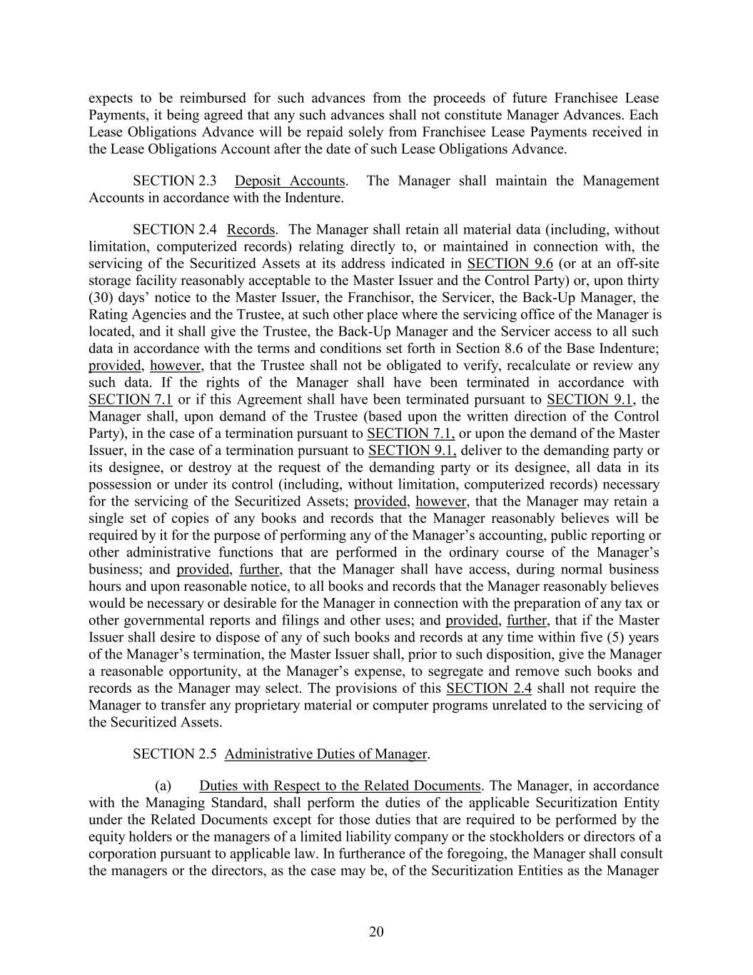 expects to be reimbursed for such advances from the proceeds of future Franchisee Lease Payments, it being agreed that any such advances shall not constitute Manager Advances. Each Lease Obligations Advance will be repaid solely from Franchisee Lease Payments received in the Lease Obligations Account after the date of such Lease Obligations Advance. SECTION 2.3 Deposit Accounts. The Manager shall maintain the Management Accounts in accordance with the Indenture. SECTION 2.4 Records. The Manager shall retain all material data (including, without limitation, computerized records) relating directly to, or maintained in connection with, the servicing of the Securitized Assets at its address indicated in SECTION 9.6 (or at an off-site storage facility reasonably acceptable to the Master Issuer and the Control Party) or, upon thirty (30) days’ notice to the Master Issuer, the Franchisor, the Servicer, the Back-Up Manager, the Rating Agencies and the Trustee, at such other place where the servicing office of the Manager is located, and it shall give the Trustee, the Back-Up Manager and the Servicer access to all such data in accordance with the terms and conditions set forth in Section 8.6 of the Base Indenture; provided, however, that the Trustee shall not be obligated to verify, recalculate or review any such data. If the rights of the Manager shall have been terminated in accordance with SECTION 7.1 or if this Agreement shall have been terminated pursuant to SECTION 9.1, the Manager shall, upon demand of the Trustee (based upon the written direction of the Control Party), in the case of a termination pursuant to SECTION 7.1, or upon the demand of the Master Issuer, in the case of a termination pursuant to SECTION 9.1, deliver to the demanding party or its designee, or destroy at the request of the demanding party or its designee, all data in its possession or under its control (including, without limitation, computerized records) necessary for the servicing of the Securitized Assets; provided, however, that the Manager may retain a single set of copies of any books and records that the Manager reasonably believes will be required by it for the purpose of performing any of the Manager’s accounting, public reporting or other administrative functions that are performed in the ordinary course of the Manager’s business; and provided, further, that the Manager shall have access, during normal business hours and upon reasonable notice, to all books and records that the Manager reasonably believes would be necessary or desirable for the Manager in connection with the preparation of any tax or other governmental reports and filings and other uses; and provided, further, that if the Master Issuer shall desire to dispose of any of such books and records at any time within five (5) years of the Manager’s termination, the Master Issuer shall, prior to such disposition, give the Manager a reasonable opportunity, at the Manager’s expense, to segregate and remove such books and records as the Manager may select. The provisions of this SECTION 2.4 shall not require the Manager to transfer any proprietary material or computer programs unrelated to the servicing of the Securitized Assets. SECTION 2.5 Administrative Duties of Manager. (a) Duties with Respect to the Related Documents. The Manager, in accordance with the Managing Standard, shall perform the duties of the applicable Securitization Entity under the Related Documents except for those duties that are required to be performed by the equity holders or the managers of a limited liability company or the stockholders or directors of a corporation pursuant to applicable law. In furtherance of the foregoing, the Manager shall consult the managers or the directors, as the case may be, of the Securitization Entities as the Manager 20