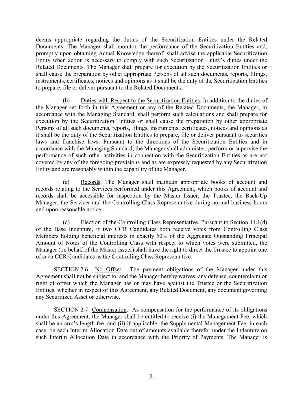 deems appropriate regarding the duties of the Securitization Entities under the Related Documents. The Manager shall monitor the performance of the Securitization Entities and, promptly upon obtaining Actual Knowledge thereof, shall advise the applicable Securitization Entity when action is necessary to comply with such Securitization Entity’s duties under the Related Documents. The Manager shall prepare for execution by the Securitization Entities or shall cause the preparation by other appropriate Persons of all such documents, reports, filings, instruments, certificates, notices and opinions as it shall be the duty of the Securitization Entities to prepare, file or deliver pursuant to the Related Documents. (b) Duties with Respect to the Securitization Entities. In addition to the duties of the Manager set forth in this Agreement or any of the Related Documents, the Manager, in accordance with the Managing Standard, shall perform such calculations and shall prepare for execution by the Securitization Entities or shall cause the preparation by other appropriate Persons of all such documents, reports, filings, instruments, certificates, notices and opinions as it shall be the duty of the Securitization Entities to prepare, file or deliver pursuant to securities laws and franchise laws. Pursuant to the directions of the Securitization Entities and in accordance with the Managing Standard, the Manager shall administer, perform or supervise the performance of such other activities in connection with the Securitization Entities as are not covered by any of the foregoing provisions and as are expressly requested by any Securitization Entity and are reasonably within the capability of the Manager. (c) Records. The Manager shall maintain appropriate books of account and records relating to the Services performed under this Agreement, which books of account and records shall be accessible for inspection by the Master Issuer, the Trustee, the Back-Up Manager, the Servicer and the Controlling Class Representative during normal business hours and upon reasonable notice. (d) Election of the Controlling Class Representative. Pursuant to Section 11.1(d) of the Base Indenture, if two CCR Candidates both receive votes from Controlling Class Members holding beneficial interests in exactly 50% of the Aggregate Outstanding Principal Amount of Notes of the Controlling Class with respect to which votes were submitted, the Manager (on behalf of the Master Issuer) shall have the right to direct the Trustee to appoint one of such CCR Candidates as the Controlling Class Representative. SECTION 2.6 No Offset. The payment obligations of the Manager under this Agreement shall not be subject to, and the Manager hereby waives, any defense, counterclaim or right of offset which the Manager has or may have against the Trustee or the Securitization Entities, whether in respect of this Agreement, any Related Document, any document governing any Securitized Asset or otherwise. SECTION 2.7 Compensation. As compensation for the performance of its obligations under this Agreement, the Manager shall be entitled to receive (i) the Management Fee, which shall be an arm’s length fee, and (ii) if applicable, the Supplemental Management Fee, in each case, on each Interim Allocation Date out of amounts available therefor under the Indenture on such Interim Allocation Date in accordance with the Priority of Payments. The Manager is 21
