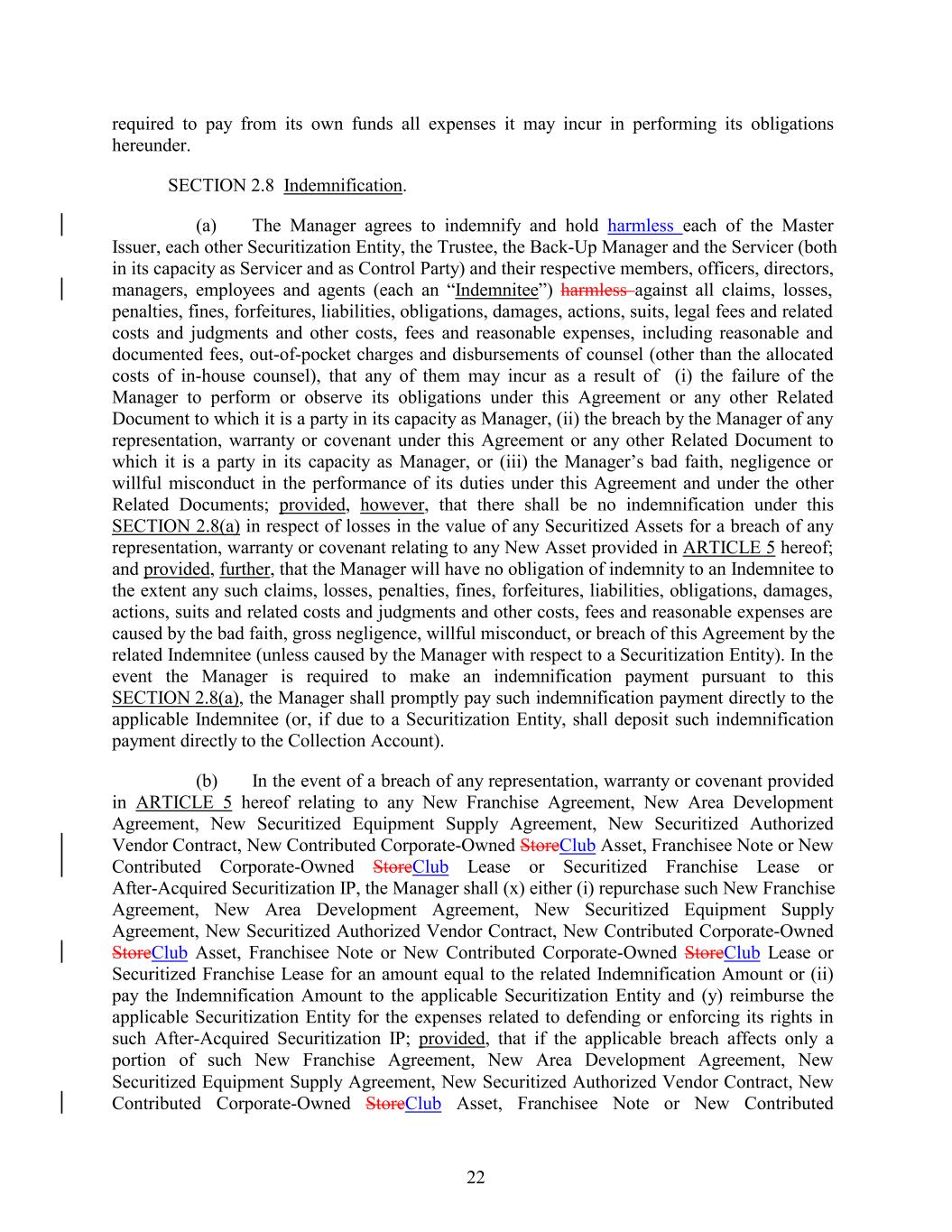 required to pay from its own funds all expenses it may incur in performing its obligations hereunder. SECTION 2.8 Indemnification. (a) The Manager agrees to indemnify and hold harmless each of the Master Issuer, each other Securitization Entity, the Trustee, the Back-Up Manager and the Servicer (both in its capacity as Servicer and as Control Party) and their respective members, officers, directors, managers, employees and agents (each an “Indemnitee”) harmless against all claims, losses, penalties, fines, forfeitures, liabilities, obligations, damages, actions, suits, legal fees and related costs and judgments and other costs, fees and reasonable expenses, including reasonable and documented fees, out-of-pocket charges and disbursements of counsel (other than the allocated costs of in-house counsel), that any of them may incur as a result of (i) the failure of the Manager to perform or observe its obligations under this Agreement or any other Related Document to which it is a party in its capacity as Manager, (ii) the breach by the Manager of any representation, warranty or covenant under this Agreement or any other Related Document to which it is a party in its capacity as Manager, or (iii) the Manager’s bad faith, negligence or willful misconduct in the performance of its duties under this Agreement and under the other Related Documents; provided, however, that there shall be no indemnification under this SECTION 2.8(a) in respect of losses in the value of any Securitized Assets for a breach of any representation, warranty or covenant relating to any New Asset provided in ARTICLE 5 hereof; and provided, further, that the Manager will have no obligation of indemnity to an Indemnitee to the extent any such claims, losses, penalties, fines, forfeitures, liabilities, obligations, damages, actions, suits and related costs and judgments and other costs, fees and reasonable expenses are caused by the bad faith, gross negligence, willful misconduct, or breach of this Agreement by the related Indemnitee (unless caused by the Manager with respect to a Securitization Entity). In the event the Manager is required to make an indemnification payment pursuant to this SECTION 2.8(a), the Manager shall promptly pay such indemnification payment directly to the applicable Indemnitee (or, if due to a Securitization Entity, shall deposit such indemnification payment directly to the Collection Account). (b) In the event of a breach of any representation, warranty or covenant provided in ARTICLE 5 hereof relating to any New Franchise Agreement, New Area Development Agreement, New Securitized Equipment Supply Agreement, New Securitized Authorized Vendor Contract, New Contributed Corporate-Owned StoreClub Asset, Franchisee Note or New Contributed Corporate-Owned StoreClub Lease or Securitized Franchise Lease or After-Acquired Securitization IP, the Manager shall (x) either (i) repurchase such New Franchise Agreement, New Area Development Agreement, New Securitized Equipment Supply Agreement, New Securitized Authorized Vendor Contract, New Contributed Corporate-Owned StoreClub Asset, Franchisee Note or New Contributed Corporate-Owned StoreClub Lease or Securitized Franchise Lease for an amount equal to the related Indemnification Amount or (ii) pay the Indemnification Amount to the applicable Securitization Entity and (y) reimburse the applicable Securitization Entity for the expenses related to defending or enforcing its rights in such After-Acquired Securitization IP; provided, that if the applicable breach affects only a portion of such New Franchise Agreement, New Area Development Agreement, New Securitized Equipment Supply Agreement, New Securitized Authorized Vendor Contract, New Contributed Corporate-Owned StoreClub Asset, Franchisee Note or New Contributed 22