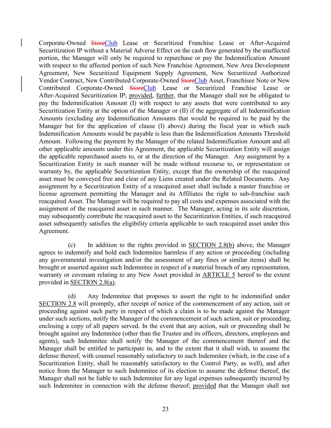 Corporate-Owned StoreClub Lease or Securitized Franchise Lease or After-Acquired Securitization IP without a Material Adverse Effect on the cash flow generated by the unaffected portion, the Manager will only be required to repurchase or pay the Indemnification Amount with respect to the affected portion of such New Franchise Agreement, New Area Development Agreement, New Securitized Equipment Supply Agreement, New Securitized Authorized Vendor Contract, New Contributed Corporate-Owned StoreClub Asset, Franchisee Note or New Contributed Corporate-Owned StoreClub Lease or Securitized Franchise Lease or After-Acquired Securitization IP; provided, further, that the Manager shall not be obligated to pay the Indemnification Amount (I) with respect to any assets that were contributed to any Securitization Entity at the option of the Manager or (II) if the aggregate of all Indemnification Amounts (excluding any Indemnification Amounts that would be required to be paid by the Manager but for the application of clause (I) above) during the fiscal year in which such Indemnification Amounts would be payable is less than the Indemnification Amounts Threshold Amount. Following the payment by the Manager of the related Indemnification Amount and all other applicable amounts under this Agreement, the applicable Securitization Entity will assign the applicable repurchased assets to, or at the direction of the Manager. Any assignment by a Securitization Entity in such manner will be made without recourse to, or representation or warranty by, the applicable Securitization Entity, except that the ownership of the reacquired asset must be conveyed free and clear of any Liens created under the Related Documents. Any assignment by a Securitization Entity of a reacquired asset shall include a master franchise or license agreement permitting the Manager and its Affiliates the right to sub-franchise such reacquired Asset. The Manager will be required to pay all costs and expenses associated with the assignment of the reacquired asset in such manner. The Manager, acting in its sole discretion, may subsequently contribute the reacquired asset to the Securitization Entities, if such reacquired asset subsequently satisfies the eligibility criteria applicable to such reacquired asset under this Agreement. (c) In addition to the rights provided in SECTION 2.8(b) above, the Manager agrees to indemnify and hold each Indemnitee harmless if any action or proceeding (including any governmental investigation and/or the assessment of any fines or similar items) shall be brought or asserted against such Indemnitee in respect of a material breach of any representation, warranty or covenant relating to any New Asset provided in ARTICLE 5 hereof to the extent provided in SECTION 2.8(a). (d) Any Indemnitee that proposes to assert the right to be indemnified under SECTION 2.8 will promptly, after receipt of notice of the commencement of any action, suit or proceeding against such party in respect of which a claim is to be made against the Manager under such sections, notify the Manager of the commencement of such action, suit or proceeding, enclosing a copy of all papers served. In the event that any action, suit or proceeding shall be brought against any Indemnitee (other than the Trustee and its officers, directors, employees and agents), such Indemnitee shall notify the Manager of the commencement thereof and the Manager shall be entitled to participate in, and to the extent that it shall wish, to assume the defense thereof, with counsel reasonably satisfactory to such Indemnitee (which, in the case of a Securitization Entity, shall be reasonably satisfactory to the Control Party, as well), and after notice from the Manager to such Indemnitee of its election to assume the defense thereof, the Manager shall not be liable to such Indemnitee for any legal expenses subsequently incurred by such Indemnitee in connection with the defense thereof; provided that the Manager shall not 23