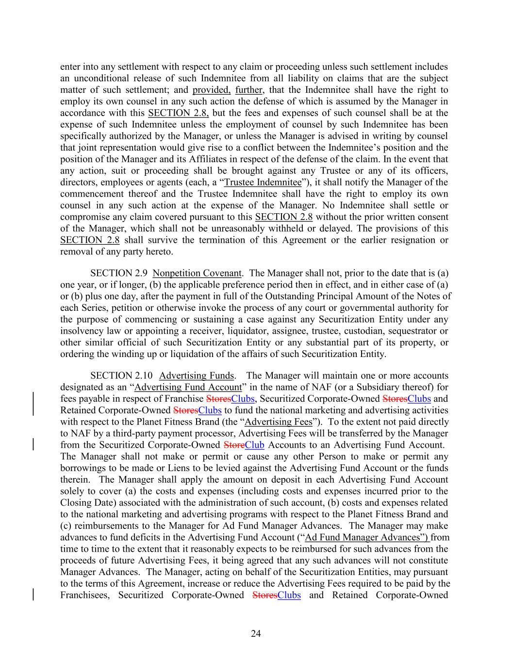 enter into any settlement with respect to any claim or proceeding unless such settlement includes an unconditional release of such Indemnitee from all liability on claims that are the subject matter of such settlement; and provided, further, that the Indemnitee shall have the right to employ its own counsel in any such action the defense of which is assumed by the Manager in accordance with this SECTION 2.8, but the fees and expenses of such counsel shall be at the expense of such Indemnitee unless the employment of counsel by such Indemnitee has been specifically authorized by the Manager, or unless the Manager is advised in writing by counsel that joint representation would give rise to a conflict between the Indemnitee’s position and the position of the Manager and its Affiliates in respect of the defense of the claim. In the event that any action, suit or proceeding shall be brought against any Trustee or any of its officers, directors, employees or agents (each, a “Trustee Indemnitee”), it shall notify the Manager of the commencement thereof and the Trustee Indemnitee shall have the right to employ its own counsel in any such action at the expense of the Manager. No Indemnitee shall settle or compromise any claim covered pursuant to this SECTION 2.8 without the prior written consent of the Manager, which shall not be unreasonably withheld or delayed. The provisions of this SECTION 2.8 shall survive the termination of this Agreement or the earlier resignation or removal of any party hereto. SECTION 2.9 Nonpetition Covenant. The Manager shall not, prior to the date that is (a) one year, or if longer, (b) the applicable preference period then in effect, and in either case of (a) or (b) plus one day, after the payment in full of the Outstanding Principal Amount of the Notes of each Series, petition or otherwise invoke the process of any court or governmental authority for the purpose of commencing or sustaining a case against any Securitization Entity under any insolvency law or appointing a receiver, liquidator, assignee, trustee, custodian, sequestrator or other similar official of such Securitization Entity or any substantial part of its property, or ordering the winding up or liquidation of the affairs of such Securitization Entity. SECTION 2.10 Advertising Funds. The Manager will maintain one or more accounts designated as an “Advertising Fund Account” in the name of NAF (or a Subsidiary thereof) for fees payable in respect of Franchise StoresClubs, Securitized Corporate-Owned StoresClubs and Retained Corporate-Owned StoresClubs to fund the national marketing and advertising activities with respect to the Planet Fitness Brand (the “Advertising Fees”). To the extent not paid directly to NAF by a third-party payment processor, Advertising Fees will be transferred by the Manager from the Securitized Corporate-Owned StoreClub Accounts to an Advertising Fund Account. The Manager shall not make or permit or cause any other Person to make or permit any borrowings to be made or Liens to be levied against the Advertising Fund Account or the funds therein. The Manager shall apply the amount on deposit in each Advertising Fund Account solely to cover (a) the costs and expenses (including costs and expenses incurred prior to the Closing Date) associated with the administration of such account, (b) costs and expenses related to the national marketing and advertising programs with respect to the Planet Fitness Brand and (c) reimbursements to the Manager for Ad Fund Manager Advances. The Manager may make advances to fund deficits in the Advertising Fund Account (“Ad Fund Manager Advances”) from time to time to the extent that it reasonably expects to be reimbursed for such advances from the proceeds of future Advertising Fees, it being agreed that any such advances will not constitute Manager Advances. The Manager, acting on behalf of the Securitization Entities, may pursuant to the terms of this Agreement, increase or reduce the Advertising Fees required to be paid by the Franchisees, Securitized Corporate-Owned StoresClubs and Retained Corporate-Owned 24