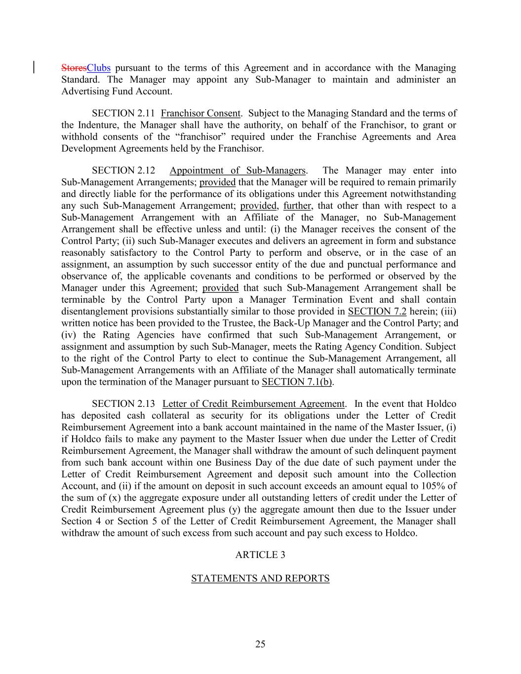 StoresClubs pursuant to the terms of this Agreement and in accordance with the Managing Standard. The Manager may appoint any Sub-Manager to maintain and administer an Advertising Fund Account. SECTION 2.11 Franchisor Consent. Subject to the Managing Standard and the terms of the Indenture, the Manager shall have the authority, on behalf of the Franchisor, to grant or withhold consents of the “franchisor” required under the Franchise Agreements and Area Development Agreements held by the Franchisor. SECTION 2.12 Appointment of Sub-Managers. The Manager may enter into Sub-Management Arrangements; provided that the Manager will be required to remain primarily and directly liable for the performance of its obligations under this Agreement notwithstanding any such Sub-Management Arrangement; provided, further, that other than with respect to a Sub-Management Arrangement with an Affiliate of the Manager, no Sub-Management Arrangement shall be effective unless and until: (i) the Manager receives the consent of the Control Party; (ii) such Sub-Manager executes and delivers an agreement in form and substance reasonably satisfactory to the Control Party to perform and observe, or in the case of an assignment, an assumption by such successor entity of the due and punctual performance and observance of, the applicable covenants and conditions to be performed or observed by the Manager under this Agreement; provided that such Sub-Management Arrangement shall be terminable by the Control Party upon a Manager Termination Event and shall contain disentanglement provisions substantially similar to those provided in SECTION 7.2 herein; (iii) written notice has been provided to the Trustee, the Back-Up Manager and the Control Party; and (iv) the Rating Agencies have confirmed that such Sub-Management Arrangement, or assignment and assumption by such Sub-Manager, meets the Rating Agency Condition. Subject to the right of the Control Party to elect to continue the Sub-Management Arrangement, all Sub-Management Arrangements with an Affiliate of the Manager shall automatically terminate upon the termination of the Manager pursuant to SECTION 7.1(b). SECTION 2.13 Letter of Credit Reimbursement Agreement. In the event that Holdco has deposited cash collateral as security for its obligations under the Letter of Credit Reimbursement Agreement into a bank account maintained in the name of the Master Issuer, (i) if Holdco fails to make any payment to the Master Issuer when due under the Letter of Credit Reimbursement Agreement, the Manager shall withdraw the amount of such delinquent payment from such bank account within one Business Day of the due date of such payment under the Letter of Credit Reimbursement Agreement and deposit such amount into the Collection Account, and (ii) if the amount on deposit in such account exceeds an amount equal to 105% of the sum of (x) the aggregate exposure under all outstanding letters of credit under the Letter of Credit Reimbursement Agreement plus (y) the aggregate amount then due to the Issuer under Section 4 or Section 5 of the Letter of Credit Reimbursement Agreement, the Manager shall withdraw the amount of such excess from such account and pay such excess to Holdco. ARTICLE 3 STATEMENTS AND REPORTS 25