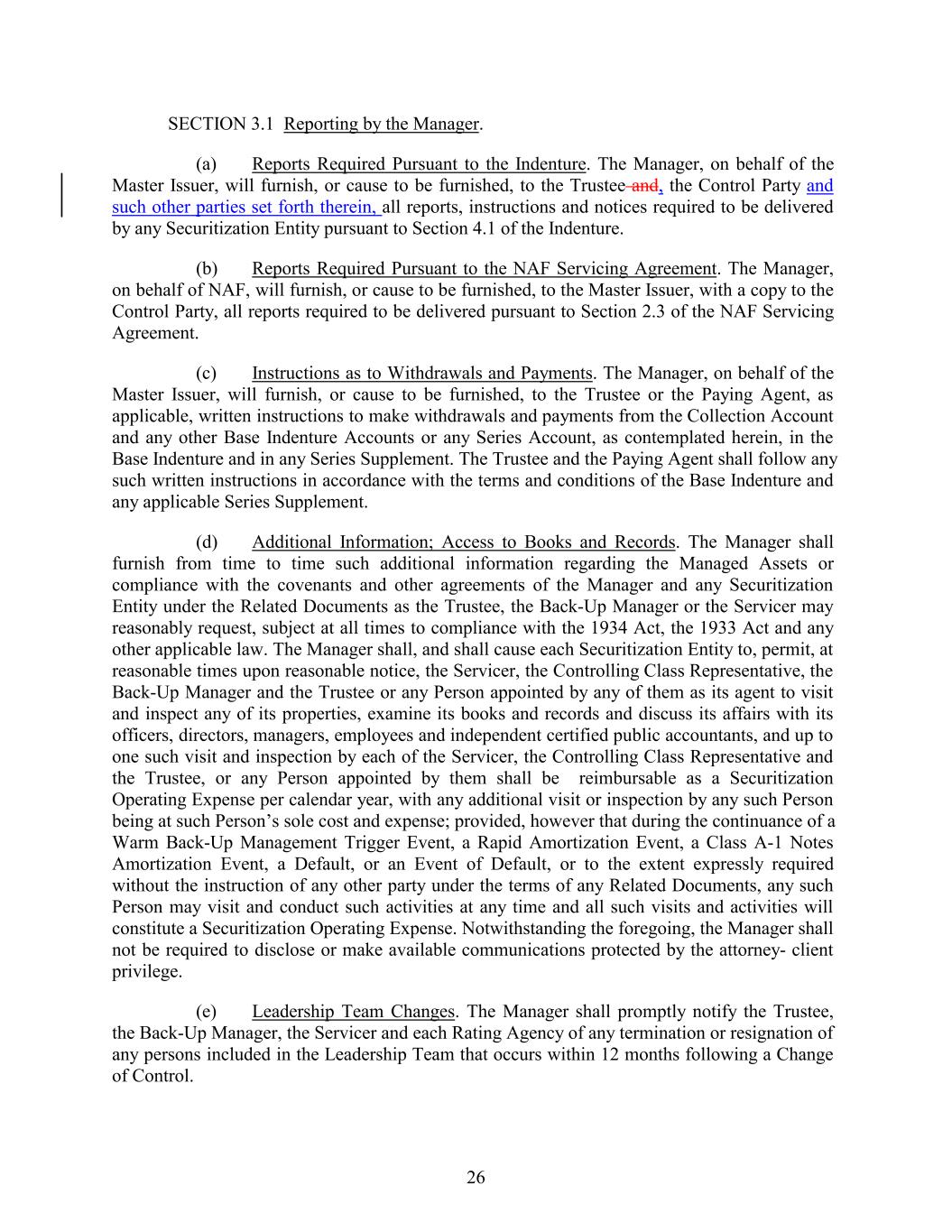 SECTION 3.1 Reporting by the Manager. (a) Reports Required Pursuant to the Indenture. The Manager, on behalf of the Master Issuer, will furnish, or cause to be furnished, to the Trustee and, the Control Party and such other parties set forth therein, all reports, instructions and notices required to be delivered by any Securitization Entity pursuant to Section 4.1 of the Indenture. (b) Reports Required Pursuant to the NAF Servicing Agreement. The Manager, on behalf of NAF, will furnish, or cause to be furnished, to the Master Issuer, with a copy to the Control Party, all reports required to be delivered pursuant to Section 2.3 of the NAF Servicing Agreement. (c) Instructions as to Withdrawals and Payments. The Manager, on behalf of the Master Issuer, will furnish, or cause to be furnished, to the Trustee or the Paying Agent, as applicable, written instructions to make withdrawals and payments from the Collection Account and any other Base Indenture Accounts or any Series Account, as contemplated herein, in the Base Indenture and in any Series Supplement. The Trustee and the Paying Agent shall follow any such written instructions in accordance with the terms and conditions of the Base Indenture and any applicable Series Supplement. (d) Additional Information; Access to Books and Records. The Manager shall furnish from time to time such additional information regarding the Managed Assets or compliance with the covenants and other agreements of the Manager and any Securitization Entity under the Related Documents as the Trustee, the Back-Up Manager or the Servicer may reasonably request, subject at all times to compliance with the 1934 Act, the 1933 Act and any other applicable law. The Manager shall, and shall cause each Securitization Entity to, permit, at reasonable times upon reasonable notice, the Servicer, the Controlling Class Representative, the Back-Up Manager and the Trustee or any Person appointed by any of them as its agent to visit and inspect any of its properties, examine its books and records and discuss its affairs with its officers, directors, managers, employees and independent certified public accountants, and up to one such visit and inspection by each of the Servicer, the Controlling Class Representative and the Trustee, or any Person appointed by them shall be reimbursable as a Securitization Operating Expense per calendar year, with any additional visit or inspection by any such Person being at such Person’s sole cost and expense; provided, however that during the continuance of a Warm Back-Up Management Trigger Event, a Rapid Amortization Event, a Class A-1 Notes Amortization Event, a Default, or an Event of Default, or to the extent expressly required without the instruction of any other party under the terms of any Related Documents, any such Person may visit and conduct such activities at any time and all such visits and activities will constitute a Securitization Operating Expense. Notwithstanding the foregoing, the Manager shall not be required to disclose or make available communications protected by the attorney- client privilege. (e) Leadership Team Changes. The Manager shall promptly notify the Trustee, the Back-Up Manager, the Servicer and each Rating Agency of any termination or resignation of any persons included in the Leadership Team that occurs within 12 months following a Change of Control. 26