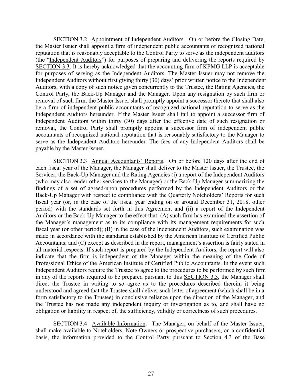 SECTION 3.2 Appointment of Independent Auditors. On or before the Closing Date, the Master Issuer shall appoint a firm of independent public accountants of recognized national reputation that is reasonably acceptable to the Control Party to serve as the independent auditors (the “Independent Auditors”) for purposes of preparing and delivering the reports required by SECTION 3.3. It is hereby acknowledged that the accounting firm of KPMG LLP is acceptable for purposes of serving as the Independent Auditors. The Master Issuer may not remove the Independent Auditors without first giving thirty (30) days’ prior written notice to the Independent Auditors, with a copy of such notice given concurrently to the Trustee, the Rating Agencies, the Control Party, the Back-Up Manager and the Manager. Upon any resignation by such firm or removal of such firm, the Master Issuer shall promptly appoint a successor thereto that shall also be a firm of independent public accountants of recognized national reputation to serve as the Independent Auditors hereunder. If the Master Issuer shall fail to appoint a successor firm of Independent Auditors within thirty (30) days after the effective date of such resignation or removal, the Control Party shall promptly appoint a successor firm of independent public accountants of recognized national reputation that is reasonably satisfactory to the Manager to serve as the Independent Auditors hereunder. The fees of any Independent Auditors shall be payable by the Master Issuer. SECTION 3.3 Annual Accountants’ Reports. On or before 120 days after the end of each fiscal year of the Manager, the Manager shall deliver to the Master Issuer, the Trustee, the Servicer, the Back-Up Manager and the Rating Agencies (i) a report of the Independent Auditors (who may also render other services to the Manager) or the Back-Up Manager summarizing the findings of a set of agreed-upon procedures performed by the Independent Auditors or the Back-Up Manager with respect to compliance with the Quarterly Noteholders’ Reports for such fiscal year (or, in the case of the fiscal year ending on or around December 31, 2018, other period) with the standards set forth in this Agreement and (ii) a report of the Independent Auditors or the Back-Up Manager to the effect that: (A) such firm has examined the assertion of the Manager’s management as to its compliance with its management requirements for such fiscal year (or other period); (B) in the case of the Independent Auditors, such examination was made in accordance with the standards established by the American Institute of Certified Public Accountants; and (C) except as described in the report, management’s assertion is fairly stated in all material respects. If such report is prepared by the Independent Auditors, the report will also indicate that the firm is independent of the Manager within the meaning of the Code of Professional Ethics of the American Institute of Certified Public Accountants. In the event such Independent Auditors require the Trustee to agree to the procedures to be performed by such firm in any of the reports required to be prepared pursuant to this SECTION 3.3, the Manager shall direct the Trustee in writing to so agree as to the procedures described therein; it being understood and agreed that the Trustee shall deliver such letter of agreement (which shall be in a form satisfactory to the Trustee) in conclusive reliance upon the direction of the Manager, and the Trustee has not made any independent inquiry or investigation as to, and shall have no obligation or liability in respect of, the sufficiency, validity or correctness of such procedures. SECTION 3.4 Available Information. The Manager, on behalf of the Master Issuer, shall make available to Noteholders, Note Owners or prospective purchasers, on a confidential basis, the information provided to the Control Party pursuant to Section 4.3 of the Base 27