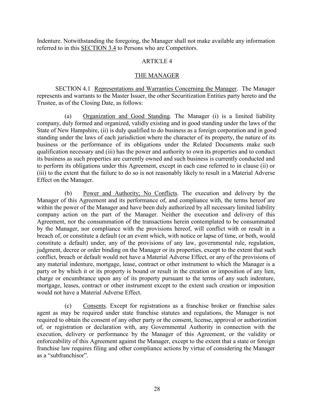 Indenture. Notwithstanding the foregoing, the Manager shall not make available any information referred to in this SECTION 3.4 to Persons who are Competitors. ARTICLE 4 THE MANAGER SECTION 4.1 Representations and Warranties Concerning the Manager. The Manager represents and warrants to the Master Issuer, the other Securitization Entities party hereto and the Trustee, as of the Closing Date, as follows: (a) Organization and Good Standing. The Manager (i) is a limited liability company, duly formed and organized, validly existing and in good standing under the laws of the State of New Hampshire, (ii) is duly qualified to do business as a foreign corporation and in good standing under the laws of each jurisdiction where the character of its property, the nature of its business or the performance of its obligations under the Related Documents make such qualification necessary and (iii) has the power and authority to own its properties and to conduct its business as such properties are currently owned and such business is currently conducted and to perform its obligations under this Agreement, except in each case referred to in clause (ii) or (iii) to the extent that the failure to do so is not reasonably likely to result in a Material Adverse Effect on the Manager. (b) Power and Authority; No Conflicts. The execution and delivery by the Manager of this Agreement and its performance of, and compliance with, the terms hereof are within the power of the Manager and have been duly authorized by all necessary limited liability company action on the part of the Manager. Neither the execution and delivery of this Agreement, nor the consummation of the transactions herein contemplated to be consummated by the Manager, nor compliance with the provisions hereof, will conflict with or result in a breach of, or constitute a default (or an event which, with notice or lapse of time, or both, would constitute a default) under, any of the provisions of any law, governmental rule, regulation, judgment, decree or order binding on the Manager or its properties, except to the extent that such conflict, breach or default would not have a Material Adverse Effect, or any of the provisions of any material indenture, mortgage, lease, contract or other instrument to which the Manager is a party or by which it or its property is bound or result in the creation or imposition of any lien, charge or encumbrance upon any of its property pursuant to the terms of any such indenture, mortgage, leases, contract or other instrument except to the extent such creation or imposition would not have a Material Adverse Effect. (c) Consents. Except for registrations as a franchise broker or franchise sales agent as may be required under state franchise statutes and regulations, the Manager is not required to obtain the consent of any other party or the consent, license, approval or authorization of, or registration or declaration with, any Governmental Authority in connection with the execution, delivery or performance by the Manager of this Agreement, or the validity or enforceability of this Agreement against the Manager, except to the extent that a state or foreign franchise law requires filing and other compliance actions by virtue of considering the Manager as a “subfranchisor”. 28