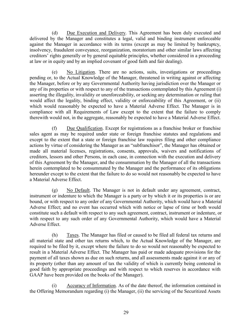 (d) Due Execution and Delivery. This Agreement has been duly executed and delivered by the Manager and constitutes a legal, valid and binding instrument enforceable against the Manager in accordance with its terms (except as may be limited by bankruptcy, insolvency, fraudulent conveyance, reorganization, moratorium and other similar laws affecting creditors’ rights generally or by general equitable principles, whether considered in a proceeding at law or in equity and by an implied covenant of good faith and fair dealing). (e) No Litigation. There are no actions, suits, investigations or proceedings pending or, to the Actual Knowledge of the Manager, threatened in writing against or affecting the Manager, before or by any Governmental Authority having jurisdiction over the Manager or any of its properties or with respect to any of the transactions contemplated by this Agreement (i) asserting the illegality, invalidity or unenforceability, or seeking any determination or ruling that would affect the legality, binding effect, validity or enforceability of this Agreement, or (ii) which would reasonably be expected to have a Material Adverse Effect. The Manager is in compliance with all Requirements of Law except to the extent that the failure to comply therewith would not, in the aggregate, reasonably be expected to have a Material Adverse Effect. (f) Due Qualification. Except for registrations as a franchise broker or franchise sales agent as may be required under state or foreign franchise statutes and regulations and except to the extent that a state or foreign franchise law requires filing and other compliance actions by virtue of considering the Manager as an “subfranchisor”, the Manager has obtained or made all material licenses, registrations, consents, approvals, waivers and notifications of creditors, lessors and other Persons, in each case, in connection with the execution and delivery of this Agreement by the Manager, and the consummation by the Manager of all the transactions herein contemplated to be consummated by the Manager and the performance of its obligations hereunder except to the extent that the failure to do so would not reasonably be expected to have a Material Adverse Effect. (g) No Default. The Manager is not in default under any agreement, contract, instrument or indenture to which the Manager is a party or by which it or its properties is or are bound, or with respect to any order of any Governmental Authority, which would have a Material Adverse Effect; and no event has occurred which with notice or lapse of time or both would constitute such a default with respect to any such agreement, contract, instrument or indenture, or with respect to any such order of any Governmental Authority, which would have a Material Adverse Effect. (h) Taxes. The Manager has filed or caused to be filed all federal tax returns and all material state and other tax returns which, to the Actual Knowledge of the Manager, are required to be filed by it, except where the failure to do so would not reasonably be expected to result in a Material Adverse Effect. The Manager has paid or made adequate provisions for the payment of all taxes shown as due on such returns, and all assessments made against it or any of its property (other than any amount of tax the validity of which is currently being contested in good faith by appropriate proceedings and with respect to which reserves in accordance with GAAP have been provided on the books of the Manager). (i) Accuracy of Information. As of the date thereof, the information contained in the Offering Memorandum regarding (i) the Manager, (ii) the servicing of the Securitized Assets 29