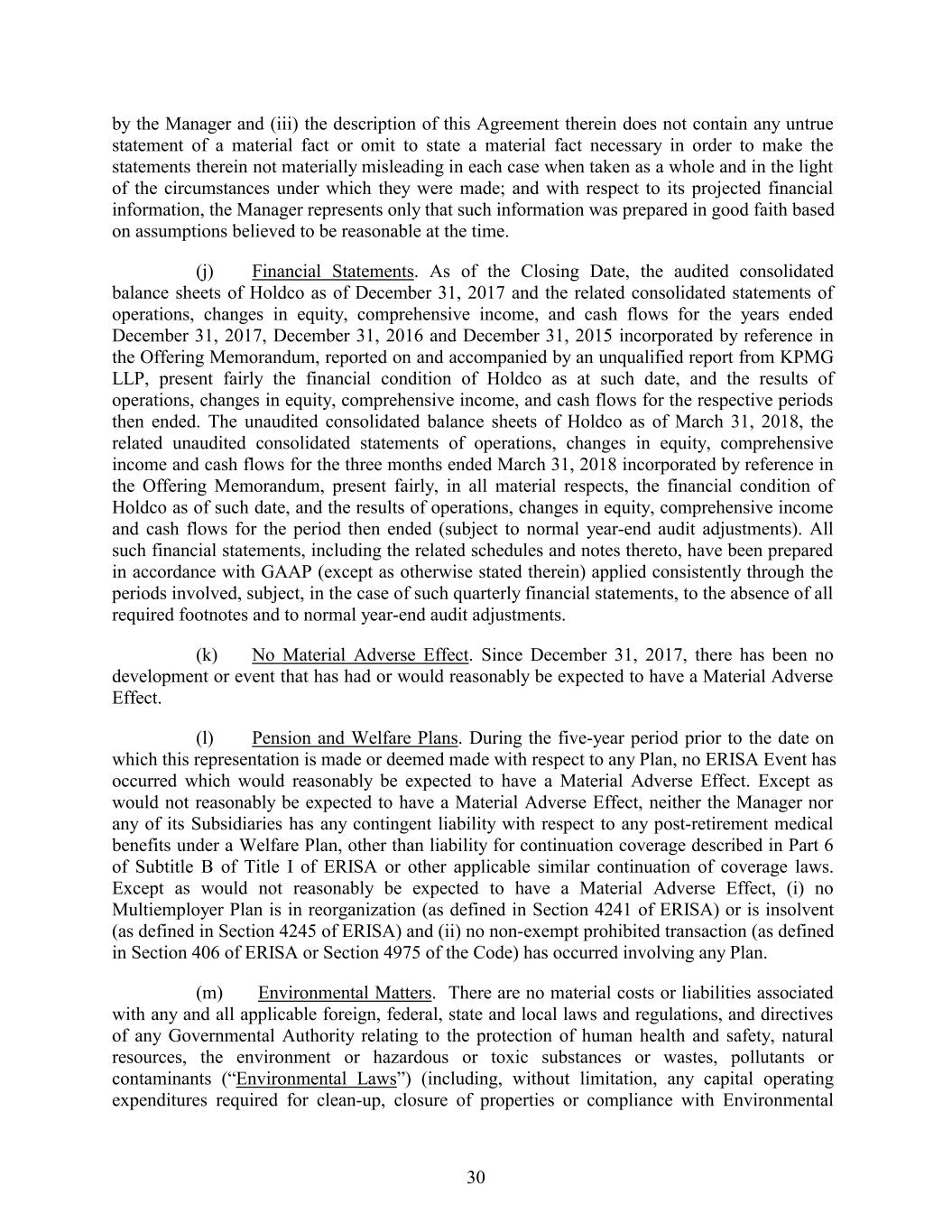 by the Manager and (iii) the description of this Agreement therein does not contain any untrue statement of a material fact or omit to state a material fact necessary in order to make the statements therein not materially misleading in each case when taken as a whole and in the light of the circumstances under which they were made; and with respect to its projected financial information, the Manager represents only that such information was prepared in good faith based on assumptions believed to be reasonable at the time. (j) Financial Statements. As of the Closing Date, the audited consolidated balance sheets of Holdco as of December 31, 2017 and the related consolidated statements of operations, changes in equity, comprehensive income, and cash flows for the years ended December 31, 2017, December 31, 2016 and December 31, 2015 incorporated by reference in the Offering Memorandum, reported on and accompanied by an unqualified report from KPMG LLP, present fairly the financial condition of Holdco as at such date, and the results of operations, changes in equity, comprehensive income, and cash flows for the respective periods then ended. The unaudited consolidated balance sheets of Holdco as of March 31, 2018, the related unaudited consolidated statements of operations, changes in equity, comprehensive income and cash flows for the three months ended March 31, 2018 incorporated by reference in the Offering Memorandum, present fairly, in all material respects, the financial condition of Holdco as of such date, and the results of operations, changes in equity, comprehensive income and cash flows for the period then ended (subject to normal year-end audit adjustments). All such financial statements, including the related schedules and notes thereto, have been prepared in accordance with GAAP (except as otherwise stated therein) applied consistently through the periods involved, subject, in the case of such quarterly financial statements, to the absence of all required footnotes and to normal year-end audit adjustments. (k) No Material Adverse Effect. Since December 31, 2017, there has been no development or event that has had or would reasonably be expected to have a Material Adverse Effect. (l) Pension and Welfare Plans. During the five-year period prior to the date on which this representation is made or deemed made with respect to any Plan, no ERISA Event has occurred which would reasonably be expected to have a Material Adverse Effect. Except as would not reasonably be expected to have a Material Adverse Effect, neither the Manager nor any of its Subsidiaries has any contingent liability with respect to any post-retirement medical benefits under a Welfare Plan, other than liability for continuation coverage described in Part 6 of Subtitle B of Title I of ERISA or other applicable similar continuation of coverage laws. Except as would not reasonably be expected to have a Material Adverse Effect, (i) no Multiemployer Plan is in reorganization (as defined in Section 4241 of ERISA) or is insolvent (as defined in Section 4245 of ERISA) and (ii) no non-exempt prohibited transaction (as defined in Section 406 of ERISA or Section 4975 of the Code) has occurred involving any Plan. (m) Environmental Matters. There are no material costs or liabilities associated with any and all applicable foreign, federal, state and local laws and regulations, and directives of any Governmental Authority relating to the protection of human health and safety, natural resources, the environment or hazardous or toxic substances or wastes, pollutants or contaminants (“Environmental Laws”) (including, without limitation, any capital operating expenditures required for clean-up, closure of properties or compliance with Environmental 30