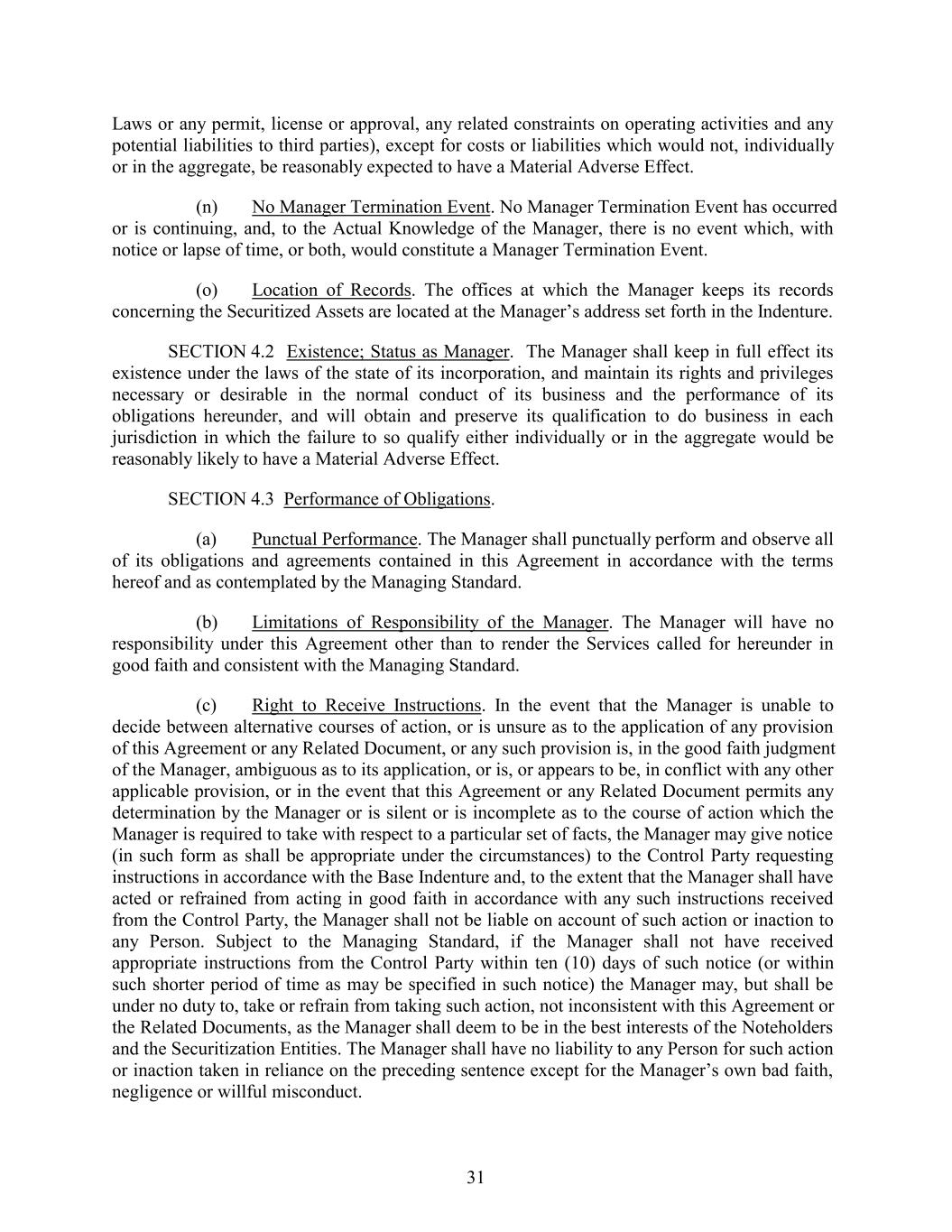 Laws or any permit, license or approval, any related constraints on operating activities and any potential liabilities to third parties), except for costs or liabilities which would not, individually or in the aggregate, be reasonably expected to have a Material Adverse Effect. (n) No Manager Termination Event. No Manager Termination Event has occurred or is continuing, and, to the Actual Knowledge of the Manager, there is no event which, with notice or lapse of time, or both, would constitute a Manager Termination Event. (o) Location of Records. The offices at which the Manager keeps its records concerning the Securitized Assets are located at the Manager’s address set forth in the Indenture. SECTION 4.2 Existence; Status as Manager. The Manager shall keep in full effect its existence under the laws of the state of its incorporation, and maintain its rights and privileges necessary or desirable in the normal conduct of its business and the performance of its obligations hereunder, and will obtain and preserve its qualification to do business in each jurisdiction in which the failure to so qualify either individually or in the aggregate would be reasonably likely to have a Material Adverse Effect. SECTION 4.3 Performance of Obligations. (a) Punctual Performance. The Manager shall punctually perform and observe all of its obligations and agreements contained in this Agreement in accordance with the terms hereof and as contemplated by the Managing Standard. (b) Limitations of Responsibility of the Manager. The Manager will have no responsibility under this Agreement other than to render the Services called for hereunder in good faith and consistent with the Managing Standard. (c) Right to Receive Instructions. In the event that the Manager is unable to decide between alternative courses of action, or is unsure as to the application of any provision of this Agreement or any Related Document, or any such provision is, in the good faith judgment of the Manager, ambiguous as to its application, or is, or appears to be, in conflict with any other applicable provision, or in the event that this Agreement or any Related Document permits any determination by the Manager or is silent or is incomplete as to the course of action which the Manager is required to take with respect to a particular set of facts, the Manager may give notice (in such form as shall be appropriate under the circumstances) to the Control Party requesting instructions in accordance with the Base Indenture and, to the extent that the Manager shall have acted or refrained from acting in good faith in accordance with any such instructions received from the Control Party, the Manager shall not be liable on account of such action or inaction to any Person. Subject to the Managing Standard, if the Manager shall not have received appropriate instructions from the Control Party within ten (10) days of such notice (or within such shorter period of time as may be specified in such notice) the Manager may, but shall be under no duty to, take or refrain from taking such action, not inconsistent with this Agreement or the Related Documents, as the Manager shall deem to be in the best interests of the Noteholders and the Securitization Entities. The Manager shall have no liability to any Person for such action or inaction taken in reliance on the preceding sentence except for the Manager’s own bad faith, negligence or willful misconduct. 31
