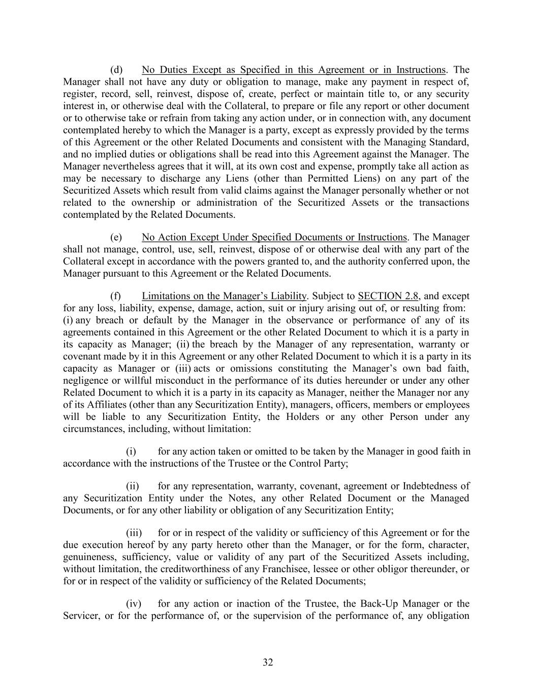 (d) No Duties Except as Specified in this Agreement or in Instructions. The Manager shall not have any duty or obligation to manage, make any payment in respect of, register, record, sell, reinvest, dispose of, create, perfect or maintain title to, or any security interest in, or otherwise deal with the Collateral, to prepare or file any report or other document or to otherwise take or refrain from taking any action under, or in connection with, any document contemplated hereby to which the Manager is a party, except as expressly provided by the terms of this Agreement or the other Related Documents and consistent with the Managing Standard, and no implied duties or obligations shall be read into this Agreement against the Manager. The Manager nevertheless agrees that it will, at its own cost and expense, promptly take all action as may be necessary to discharge any Liens (other than Permitted Liens) on any part of the Securitized Assets which result from valid claims against the Manager personally whether or not related to the ownership or administration of the Securitized Assets or the transactions contemplated by the Related Documents. (e) No Action Except Under Specified Documents or Instructions. The Manager shall not manage, control, use, sell, reinvest, dispose of or otherwise deal with any part of the Collateral except in accordance with the powers granted to, and the authority conferred upon, the Manager pursuant to this Agreement or the Related Documents. (f) Limitations on the Manager’s Liability. Subject to SECTION 2.8, and except for any loss, liability, expense, damage, action, suit or injury arising out of, or resulting from: (i) any breach or default by the Manager in the observance or performance of any of its agreements contained in this Agreement or the other Related Document to which it is a party in its capacity as Manager; (ii) the breach by the Manager of any representation, warranty or covenant made by it in this Agreement or any other Related Document to which it is a party in its capacity as Manager or (iii) acts or omissions constituting the Manager’s own bad faith, negligence or willful misconduct in the performance of its duties hereunder or under any other Related Document to which it is a party in its capacity as Manager, neither the Manager nor any of its Affiliates (other than any Securitization Entity), managers, officers, members or employees will be liable to any Securitization Entity, the Holders or any other Person under any circumstances, including, without limitation: (i) for any action taken or omitted to be taken by the Manager in good faith in accordance with the instructions of the Trustee or the Control Party; (ii) for any representation, warranty, covenant, agreement or Indebtedness of any Securitization Entity under the Notes, any other Related Document or the Managed Documents, or for any other liability or obligation of any Securitization Entity; (iii) for or in respect of the validity or sufficiency of this Agreement or for the due execution hereof by any party hereto other than the Manager, or for the form, character, genuineness, sufficiency, value or validity of any part of the Securitized Assets including, without limitation, the creditworthiness of any Franchisee, lessee or other obligor thereunder, or for or in respect of the validity or sufficiency of the Related Documents; (iv) for any action or inaction of the Trustee, the Back-Up Manager or the Servicer, or for the performance of, or the supervision of the performance of, any obligation 32