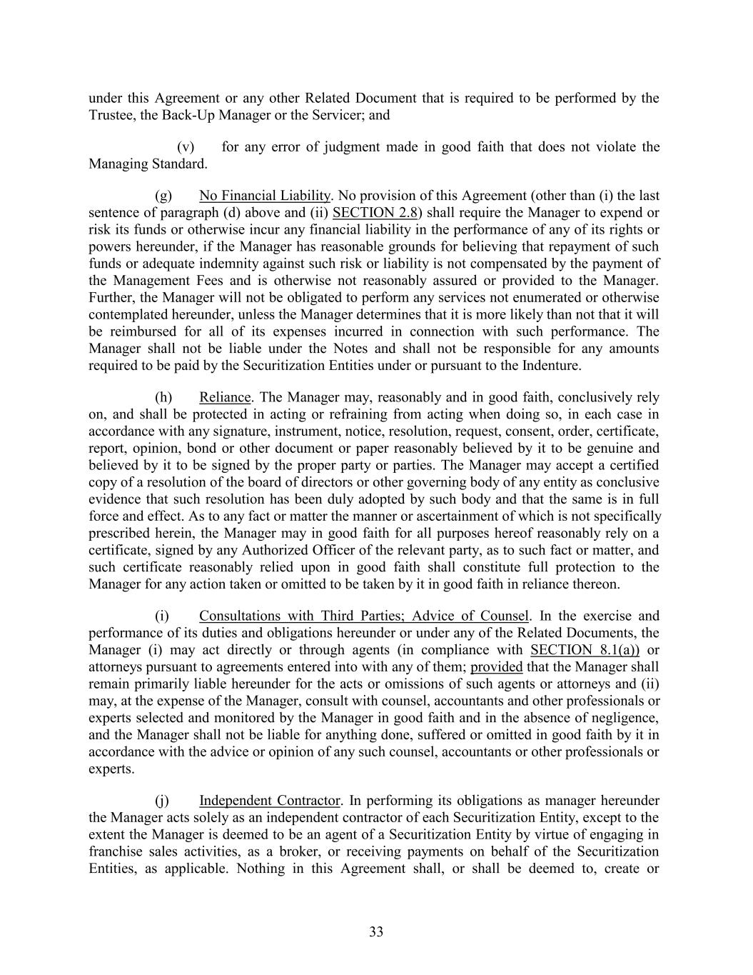 under this Agreement or any other Related Document that is required to be performed by the Trustee, the Back-Up Manager or the Servicer; and (v) for any error of judgment made in good faith that does not violate the Managing Standard. (g) No Financial Liability. No provision of this Agreement (other than (i) the last sentence of paragraph (d) above and (ii) SECTION 2.8) shall require the Manager to expend or risk its funds or otherwise incur any financial liability in the performance of any of its rights or powers hereunder, if the Manager has reasonable grounds for believing that repayment of such funds or adequate indemnity against such risk or liability is not compensated by the payment of the Management Fees and is otherwise not reasonably assured or provided to the Manager. Further, the Manager will not be obligated to perform any services not enumerated or otherwise contemplated hereunder, unless the Manager determines that it is more likely than not that it will be reimbursed for all of its expenses incurred in connection with such performance. The Manager shall not be liable under the Notes and shall not be responsible for any amounts required to be paid by the Securitization Entities under or pursuant to the Indenture. (h) Reliance. The Manager may, reasonably and in good faith, conclusively rely on, and shall be protected in acting or refraining from acting when doing so, in each case in accordance with any signature, instrument, notice, resolution, request, consent, order, certificate, report, opinion, bond or other document or paper reasonably believed by it to be genuine and believed by it to be signed by the proper party or parties. The Manager may accept a certified copy of a resolution of the board of directors or other governing body of any entity as conclusive evidence that such resolution has been duly adopted by such body and that the same is in full force and effect. As to any fact or matter the manner or ascertainment of which is not specifically prescribed herein, the Manager may in good faith for all purposes hereof reasonably rely on a certificate, signed by any Authorized Officer of the relevant party, as to such fact or matter, and such certificate reasonably relied upon in good faith shall constitute full protection to the Manager for any action taken or omitted to be taken by it in good faith in reliance thereon. (i) Consultations with Third Parties; Advice of Counsel. In the exercise and performance of its duties and obligations hereunder or under any of the Related Documents, the Manager (i) may act directly or through agents (in compliance with SECTION 8.1(a)) or attorneys pursuant to agreements entered into with any of them; provided that the Manager shall remain primarily liable hereunder for the acts or omissions of such agents or attorneys and (ii) may, at the expense of the Manager, consult with counsel, accountants and other professionals or experts selected and monitored by the Manager in good faith and in the absence of negligence, and the Manager shall not be liable for anything done, suffered or omitted in good faith by it in accordance with the advice or opinion of any such counsel, accountants or other professionals or experts. (j) Independent Contractor. In performing its obligations as manager hereunder the Manager acts solely as an independent contractor of each Securitization Entity, except to the extent the Manager is deemed to be an agent of a Securitization Entity by virtue of engaging in franchise sales activities, as a broker, or receiving payments on behalf of the Securitization Entities, as applicable. Nothing in this Agreement shall, or shall be deemed to, create or 33