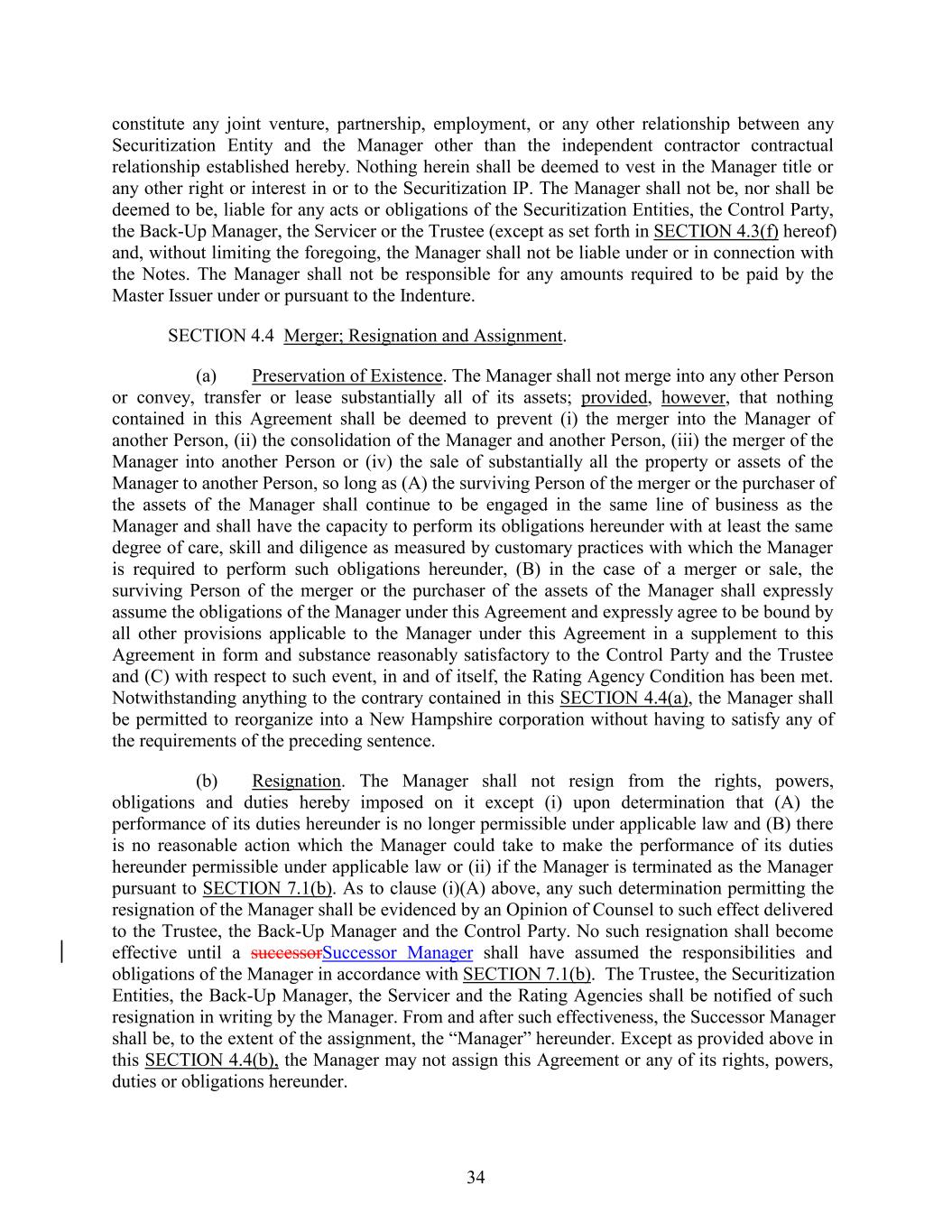 constitute any joint venture, partnership, employment, or any other relationship between any Securitization Entity and the Manager other than the independent contractor contractual relationship established hereby. Nothing herein shall be deemed to vest in the Manager title or any other right or interest in or to the Securitization IP. The Manager shall not be, nor shall be deemed to be, liable for any acts or obligations of the Securitization Entities, the Control Party, the Back-Up Manager, the Servicer or the Trustee (except as set forth in SECTION 4.3(f) hereof) and, without limiting the foregoing, the Manager shall not be liable under or in connection with the Notes. The Manager shall not be responsible for any amounts required to be paid by the Master Issuer under or pursuant to the Indenture. SECTION 4.4 Merger; Resignation and Assignment. (a) Preservation of Existence. The Manager shall not merge into any other Person or convey, transfer or lease substantially all of its assets; provided, however, that nothing contained in this Agreement shall be deemed to prevent (i) the merger into the Manager of another Person, (ii) the consolidation of the Manager and another Person, (iii) the merger of the Manager into another Person or (iv) the sale of substantially all the property or assets of the Manager to another Person, so long as (A) the surviving Person of the merger or the purchaser of the assets of the Manager shall continue to be engaged in the same line of business as the Manager and shall have the capacity to perform its obligations hereunder with at least the same degree of care, skill and diligence as measured by customary practices with which the Manager is required to perform such obligations hereunder, (B) in the case of a merger or sale, the surviving Person of the merger or the purchaser of the assets of the Manager shall expressly assume the obligations of the Manager under this Agreement and expressly agree to be bound by all other provisions applicable to the Manager under this Agreement in a supplement to this Agreement in form and substance reasonably satisfactory to the Control Party and the Trustee and (C) with respect to such event, in and of itself, the Rating Agency Condition has been met. Notwithstanding anything to the contrary contained in this SECTION 4.4(a), the Manager shall be permitted to reorganize into a New Hampshire corporation without having to satisfy any of the requirements of the preceding sentence. (b) Resignation. The Manager shall not resign from the rights, powers, obligations and duties hereby imposed on it except (i) upon determination that (A) the performance of its duties hereunder is no longer permissible under applicable law and (B) there is no reasonable action which the Manager could take to make the performance of its duties hereunder permissible under applicable law or (ii) if the Manager is terminated as the Manager pursuant to SECTION 7.1(b). As to clause (i)(A) above, any such determination permitting the resignation of the Manager shall be evidenced by an Opinion of Counsel to such effect delivered to the Trustee, the Back-Up Manager and the Control Party. No such resignation shall become effective until a successorSuccessor Manager shall have assumed the responsibilities and obligations of the Manager in accordance with SECTION 7.1(b). The Trustee, the Securitization Entities, the Back-Up Manager, the Servicer and the Rating Agencies shall be notified of such resignation in writing by the Manager. From and after such effectiveness, the Successor Manager shall be, to the extent of the assignment, the “Manager” hereunder. Except as provided above in this SECTION 4.4(b), the Manager may not assign this Agreement or any of its rights, powers, duties or obligations hereunder. 34