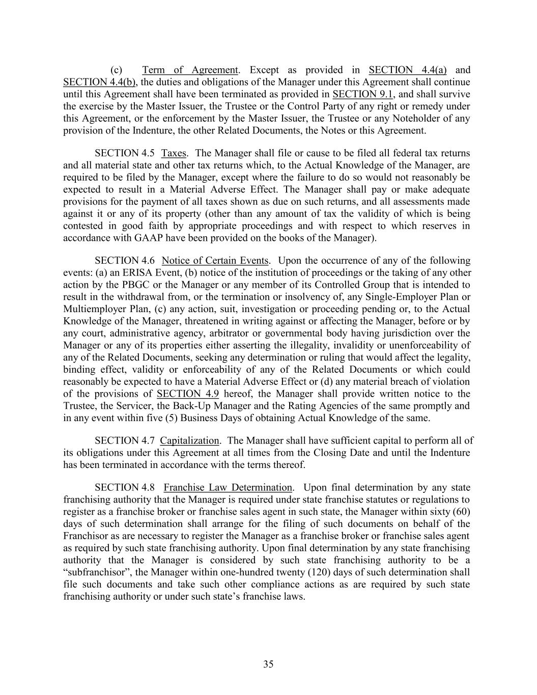 (c) Term of Agreement. Except as provided in SECTION 4.4(a) and SECTION 4.4(b), the duties and obligations of the Manager under this Agreement shall continue until this Agreement shall have been terminated as provided in SECTION 9.1, and shall survive the exercise by the Master Issuer, the Trustee or the Control Party of any right or remedy under this Agreement, or the enforcement by the Master Issuer, the Trustee or any Noteholder of any provision of the Indenture, the other Related Documents, the Notes or this Agreement. SECTION 4.5 Taxes. The Manager shall file or cause to be filed all federal tax returns and all material state and other tax returns which, to the Actual Knowledge of the Manager, are required to be filed by the Manager, except where the failure to do so would not reasonably be expected to result in a Material Adverse Effect. The Manager shall pay or make adequate provisions for the payment of all taxes shown as due on such returns, and all assessments made against it or any of its property (other than any amount of tax the validity of which is being contested in good faith by appropriate proceedings and with respect to which reserves in accordance with GAAP have been provided on the books of the Manager). SECTION 4.6 Notice of Certain Events. Upon the occurrence of any of the following events: (a) an ERISA Event, (b) notice of the institution of proceedings or the taking of any other action by the PBGC or the Manager or any member of its Controlled Group that is intended to result in the withdrawal from, or the termination or insolvency of, any Single-Employer Plan or Multiemployer Plan, (c) any action, suit, investigation or proceeding pending or, to the Actual Knowledge of the Manager, threatened in writing against or affecting the Manager, before or by any court, administrative agency, arbitrator or governmental body having jurisdiction over the Manager or any of its properties either asserting the illegality, invalidity or unenforceability of any of the Related Documents, seeking any determination or ruling that would affect the legality, binding effect, validity or enforceability of any of the Related Documents or which could reasonably be expected to have a Material Adverse Effect or (d) any material breach of violation of the provisions of SECTION 4.9 hereof, the Manager shall provide written notice to the Trustee, the Servicer, the Back-Up Manager and the Rating Agencies of the same promptly and in any event within five (5) Business Days of obtaining Actual Knowledge of the same. SECTION 4.7 Capitalization. The Manager shall have sufficient capital to perform all of its obligations under this Agreement at all times from the Closing Date and until the Indenture has been terminated in accordance with the terms thereof. SECTION 4.8 Franchise Law Determination. Upon final determination by any state franchising authority that the Manager is required under state franchise statutes or regulations to register as a franchise broker or franchise sales agent in such state, the Manager within sixty (60) days of such determination shall arrange for the filing of such documents on behalf of the Franchisor as are necessary to register the Manager as a franchise broker or franchise sales agent as required by such state franchising authority. Upon final determination by any state franchising authority that the Manager is considered by such state franchising authority to be a “subfranchisor”, the Manager within one-hundred twenty (120) days of such determination shall file such documents and take such other compliance actions as are required by such state franchising authority or under such state’s franchise laws. 35