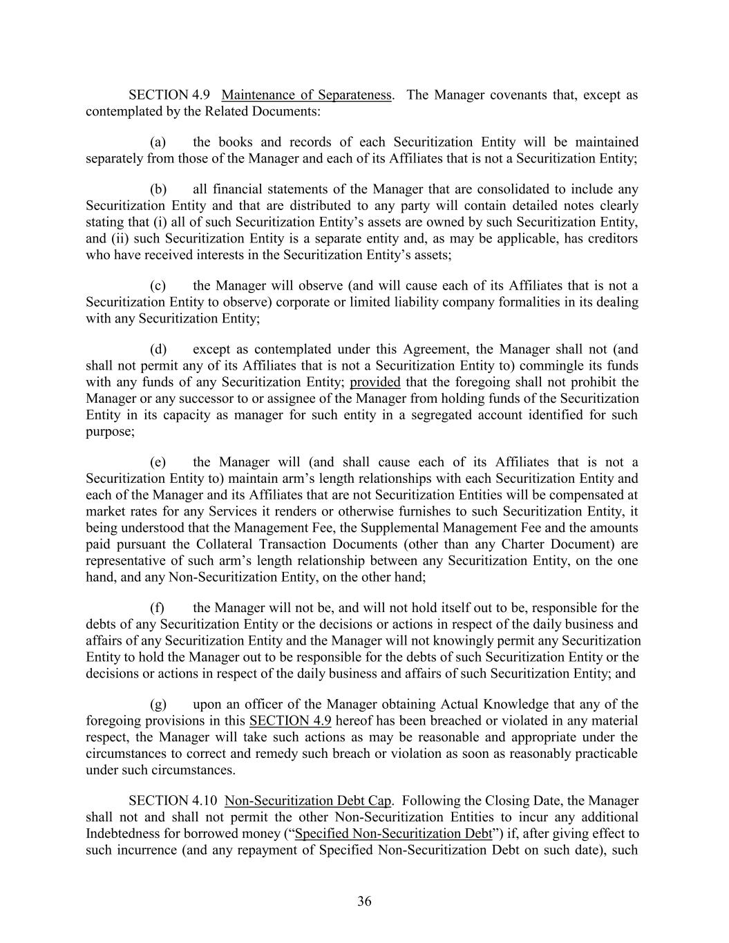 SECTION 4.9 Maintenance of Separateness. The Manager covenants that, except as contemplated by the Related Documents: (a) the books and records of each Securitization Entity will be maintained separately from those of the Manager and each of its Affiliates that is not a Securitization Entity; (b) all financial statements of the Manager that are consolidated to include any Securitization Entity and that are distributed to any party will contain detailed notes clearly stating that (i) all of such Securitization Entity’s assets are owned by such Securitization Entity, and (ii) such Securitization Entity is a separate entity and, as may be applicable, has creditors who have received interests in the Securitization Entity’s assets; (c) the Manager will observe (and will cause each of its Affiliates that is not a Securitization Entity to observe) corporate or limited liability company formalities in its dealing with any Securitization Entity; (d) except as contemplated under this Agreement, the Manager shall not (and shall not permit any of its Affiliates that is not a Securitization Entity to) commingle its funds with any funds of any Securitization Entity; provided that the foregoing shall not prohibit the Manager or any successor to or assignee of the Manager from holding funds of the Securitization Entity in its capacity as manager for such entity in a segregated account identified for such purpose; (e) the Manager will (and shall cause each of its Affiliates that is not a Securitization Entity to) maintain arm’s length relationships with each Securitization Entity and each of the Manager and its Affiliates that are not Securitization Entities will be compensated at market rates for any Services it renders or otherwise furnishes to such Securitization Entity, it being understood that the Management Fee, the Supplemental Management Fee and the amounts paid pursuant the Collateral Transaction Documents (other than any Charter Document) are representative of such arm’s length relationship between any Securitization Entity, on the one hand, and any Non-Securitization Entity, on the other hand; (f) the Manager will not be, and will not hold itself out to be, responsible for the debts of any Securitization Entity or the decisions or actions in respect of the daily business and affairs of any Securitization Entity and the Manager will not knowingly permit any Securitization Entity to hold the Manager out to be responsible for the debts of such Securitization Entity or the decisions or actions in respect of the daily business and affairs of such Securitization Entity; and (g) upon an officer of the Manager obtaining Actual Knowledge that any of the foregoing provisions in this SECTION 4.9 hereof has been breached or violated in any material respect, the Manager will take such actions as may be reasonable and appropriate under the circumstances to correct and remedy such breach or violation as soon as reasonably practicable under such circumstances. SECTION 4.10 Non-Securitization Debt Cap. Following the Closing Date, the Manager shall not and shall not permit the other Non-Securitization Entities to incur any additional Indebtedness for borrowed money (“Specified Non-Securitization Debt”) if, after giving effect to such incurrence (and any repayment of Specified Non-Securitization Debt on such date), such 36