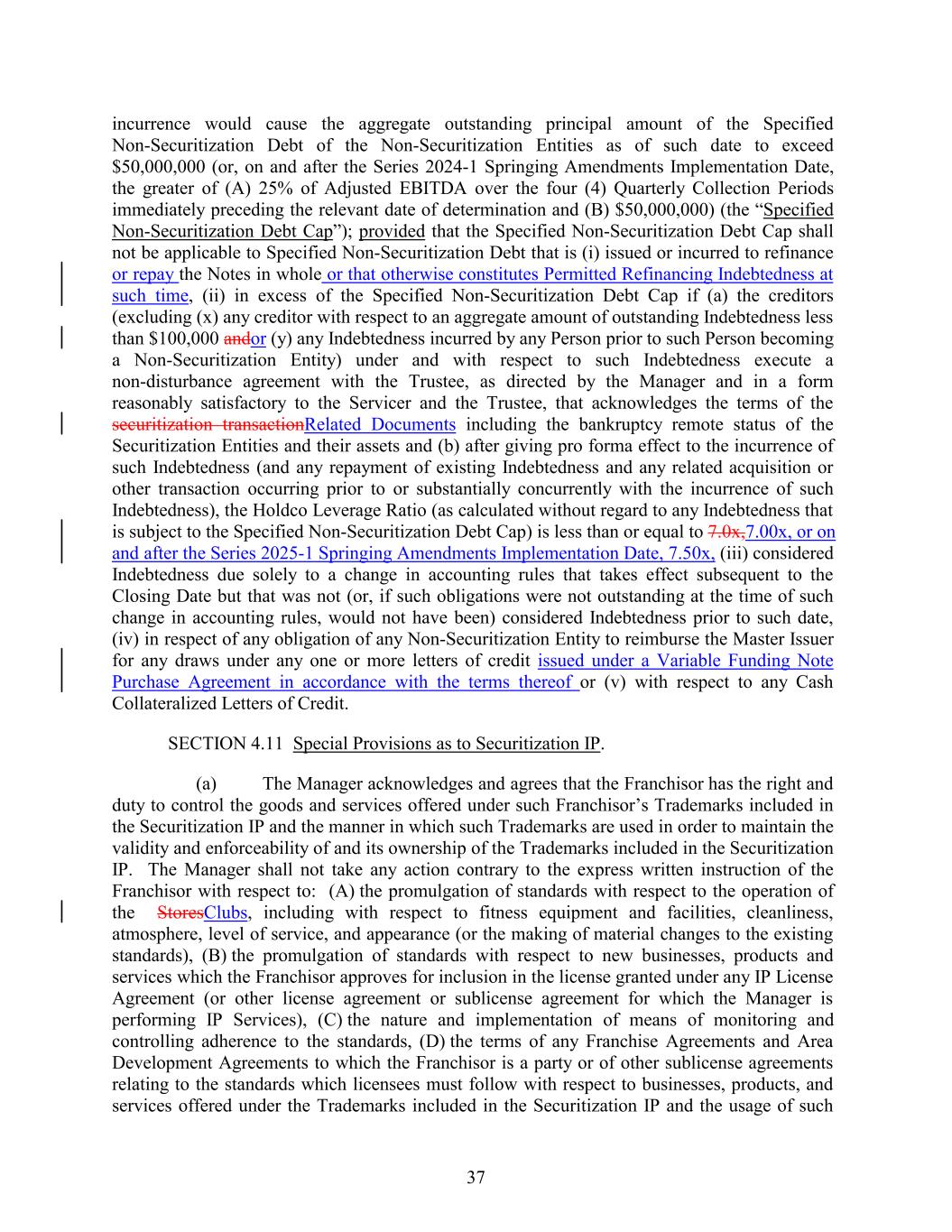 incurrence would cause the aggregate outstanding principal amount of the Specified Non-Securitization Debt of the Non-Securitization Entities as of such date to exceed $50,000,000 (or, on and after the Series 2024-1 Springing Amendments Implementation Date, the greater of (A) 25% of Adjusted EBITDA over the four (4) Quarterly Collection Periods immediately preceding the relevant date of determination and (B) $50,000,000) (the “Specified Non-Securitization Debt Cap”); provided that the Specified Non-Securitization Debt Cap shall not be applicable to Specified Non-Securitization Debt that is (i) issued or incurred to refinance or repay the Notes in whole or that otherwise constitutes Permitted Refinancing Indebtedness at such time, (ii) in excess of the Specified Non-Securitization Debt Cap if (a) the creditors (excluding (x) any creditor with respect to an aggregate amount of outstanding Indebtedness less than $100,000 andor (y) any Indebtedness incurred by any Person prior to such Person becoming a Non-Securitization Entity) under and with respect to such Indebtedness execute a non-disturbance agreement with the Trustee, as directed by the Manager and in a form reasonably satisfactory to the Servicer and the Trustee, that acknowledges the terms of the securitization transactionRelated Documents including the bankruptcy remote status of the Securitization Entities and their assets and (b) after giving pro forma effect to the incurrence of such Indebtedness (and any repayment of existing Indebtedness and any related acquisition or other transaction occurring prior to or substantially concurrently with the incurrence of such Indebtedness), the Holdco Leverage Ratio (as calculated without regard to any Indebtedness that is subject to the Specified Non-Securitization Debt Cap) is less than or equal to 7.0x,7.00x, or on and after the Series 2025-1 Springing Amendments Implementation Date, 7.50x, (iii) considered Indebtedness due solely to a change in accounting rules that takes effect subsequent to the Closing Date but that was not (or, if such obligations were not outstanding at the time of such change in accounting rules, would not have been) considered Indebtedness prior to such date, (iv) in respect of any obligation of any Non-Securitization Entity to reimburse the Master Issuer for any draws under any one or more letters of credit issued under a Variable Funding Note Purchase Agreement in accordance with the terms thereof or (v) with respect to any Cash Collateralized Letters of Credit. SECTION 4.11 Special Provisions as to Securitization IP. (a) The Manager acknowledges and agrees that the Franchisor has the right and duty to control the goods and services offered under such Franchisor’s Trademarks included in the Securitization IP and the manner in which such Trademarks are used in order to maintain the validity and enforceability of and its ownership of the Trademarks included in the Securitization IP. The Manager shall not take any action contrary to the express written instruction of the Franchisor with respect to: (A) the promulgation of standards with respect to the operation of the StoresClubs, including with respect to fitness equipment and facilities, cleanliness, atmosphere, level of service, and appearance (or the making of material changes to the existing standards), (B) the promulgation of standards with respect to new businesses, products and services which the Franchisor approves for inclusion in the license granted under any IP License Agreement (or other license agreement or sublicense agreement for which the Manager is performing IP Services), (C) the nature and implementation of means of monitoring and controlling adherence to the standards, (D) the terms of any Franchise Agreements and Area Development Agreements to which the Franchisor is a party or of other sublicense agreements relating to the standards which licensees must follow with respect to businesses, products, and services offered under the Trademarks included in the Securitization IP and the usage of such 37
