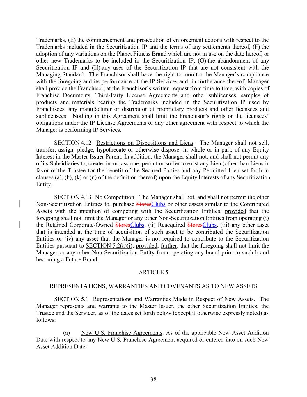 Trademarks, (E) the commencement and prosecution of enforcement actions with respect to the Trademarks included in the Securitization IP and the terms of any settlements thereof, (F) the adoption of any variations on the Planet Fitness Brand which are not in use on the date hereof, or other new Trademarks to be included in the Securitization IP, (G) the abandonment of any Securitization IP and (H) any uses of the Securitization IP that are not consistent with the Managing Standard. The Franchisor shall have the right to monitor the Manager’s compliance with the foregoing and its performance of the IP Services and, in furtherance thereof, Manager shall provide the Franchisor, at the Franchisor’s written request from time to time, with copies of Franchise Documents, Third-Party License Agreements and other sublicenses, samples of products and materials bearing the Trademarks included in the Securitization IP used by Franchisees, any manufacturer or distributor of proprietary products and other licensees and sublicensees. Nothing in this Agreement shall limit the Franchisor’s rights or the licensees’ obligations under the IP License Agreements or any other agreement with respect to which the Manager is performing IP Services. SECTION 4.12 Restrictions on Dispositions and Liens. The Manager shall not sell, transfer, assign, pledge, hypothecate or otherwise dispose, in whole or in part, of any Equity Interest in the Master Issuer Parent. In addition, the Manager shall not, and shall not permit any of its Subsidiaries to, create, incur, assume, permit or suffer to exist any Lien (other than Liens in favor of the Trustee for the benefit of the Secured Parties and any Permitted Lien set forth in clauses (a), (h), (k) or (n) of the definition thereof) upon the Equity Interests of any Securitization Entity. SECTION 4.13 No Competition. The Manager shall not, and shall not permit the other Non-Securitization Entities to, purchase StoresClubs or other assets similar to the Contributed Assets with the intention of competing with the Securitization Entities; provided that the foregoing shall not limit the Manager or any other Non-Securitization Entities from operating (i) the Retained Corporate-Owned StoresClubs, (ii) Reacquired StoresClubs, (iii) any other asset that is intended at the time of acquisition of such asset to be contributed the Securitization Entities or (iv) any asset that the Manager is not required to contribute to the Securitization Entities pursuant to SECTION 5.2(a)(i); provided, further, that the foregoing shall not limit the Manager or any other Non-Securitization Entity from operating any brand prior to such brand becoming a Future Brand. ARTICLE 5 REPRESENTATIONS, WARRANTIES AND COVENANTS AS TO NEW ASSETS SECTION 5.1 Representations and Warranties Made in Respect of New Assets. The Manager represents and warrants to the Master Issuer, the other Securitization Entities, the Trustee and the Servicer, as of the dates set forth below (except if otherwise expressly noted) as follows: (a) New U.S. Franchise Agreements. As of the applicable New Asset Addition Date with respect to any New U.S. Franchise Agreement acquired or entered into on such New Asset Addition Date: 38