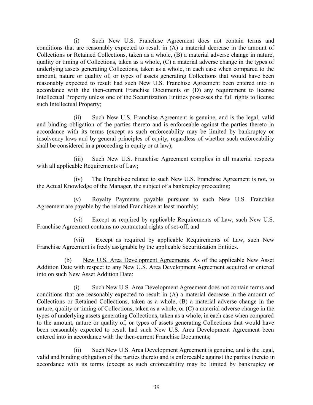 (i) Such New U.S. Franchise Agreement does not contain terms and conditions that are reasonably expected to result in (A) a material decrease in the amount of Collections or Retained Collections, taken as a whole, (B) a material adverse change in nature, quality or timing of Collections, taken as a whole, (C) a material adverse change in the types of underlying assets generating Collections, taken as a whole, in each case when compared to the amount, nature or quality of, or types of assets generating Collections that would have been reasonably expected to result had such New U.S. Franchise Agreement been entered into in accordance with the then-current Franchise Documents or (D) any requirement to license Intellectual Property unless one of the Securitization Entities possesses the full rights to license such Intellectual Property; (ii) Such New U.S. Franchise Agreement is genuine, and is the legal, valid and binding obligation of the parties thereto and is enforceable against the parties thereto in accordance with its terms (except as such enforceability may be limited by bankruptcy or insolvency laws and by general principles of equity, regardless of whether such enforceability shall be considered in a proceeding in equity or at law); (iii) Such New U.S. Franchise Agreement complies in all material respects with all applicable Requirements of Law; (iv) The Franchisee related to such New U.S. Franchise Agreement is not, to the Actual Knowledge of the Manager, the subject of a bankruptcy proceeding; (v) Royalty Payments payable pursuant to such New U.S. Franchise Agreement are payable by the related Franchisee at least monthly; (vi) Except as required by applicable Requirements of Law, such New U.S. Franchise Agreement contains no contractual rights of set-off; and (vii) Except as required by applicable Requirements of Law, such New Franchise Agreement is freely assignable by the applicable Securitization Entities. (b) New U.S. Area Development Agreements. As of the applicable New Asset Addition Date with respect to any New U.S. Area Development Agreement acquired or entered into on such New Asset Addition Date: (i) Such New U.S. Area Development Agreement does not contain terms and conditions that are reasonably expected to result in (A) a material decrease in the amount of Collections or Retained Collections, taken as a whole, (B) a material adverse change in the nature, quality or timing of Collections, taken as a whole, or (C) a material adverse change in the types of underlying assets generating Collections, taken as a whole, in each case when compared to the amount, nature or quality of, or types of assets generating Collections that would have been reasonably expected to result had such New U.S. Area Development Agreement been entered into in accordance with the then-current Franchise Documents; (ii) Such New U.S. Area Development Agreement is genuine, and is the legal, valid and binding obligation of the parties thereto and is enforceable against the parties thereto in accordance with its terms (except as such enforceability may be limited by bankruptcy or 39