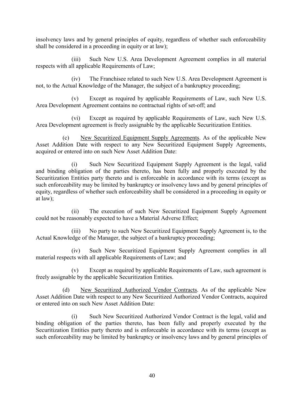 insolvency laws and by general principles of equity, regardless of whether such enforceability shall be considered in a proceeding in equity or at law); (iii) Such New U.S. Area Development Agreement complies in all material respects with all applicable Requirements of Law; (iv) The Franchisee related to such New U.S. Area Development Agreement is not, to the Actual Knowledge of the Manager, the subject of a bankruptcy proceeding; (v) Except as required by applicable Requirements of Law, such New U.S. Area Development Agreement contains no contractual rights of set-off; and (vi) Except as required by applicable Requirements of Law, such New U.S. Area Development agreement is freely assignable by the applicable Securitization Entities. (c) New Securitized Equipment Supply Agreements. As of the applicable New Asset Addition Date with respect to any New Securitized Equipment Supply Agreements, acquired or entered into on such New Asset Addition Date: (i) Such New Securitized Equipment Supply Agreement is the legal, valid and binding obligation of the parties thereto, has been fully and properly executed by the Securitization Entities party thereto and is enforceable in accordance with its terms (except as such enforceability may be limited by bankruptcy or insolvency laws and by general principles of equity, regardless of whether such enforceability shall be considered in a proceeding in equity or at law); (ii) The execution of such New Securitized Equipment Supply Agreement could not be reasonably expected to have a Material Adverse Effect; (iii) No party to such New Securitized Equipment Supply Agreement is, to the Actual Knowledge of the Manager, the subject of a bankruptcy proceeding; (iv) Such New Securitized Equipment Supply Agreement complies in all material respects with all applicable Requirements of Law; and (v) Except as required by applicable Requirements of Law, such agreement is freely assignable by the applicable Securitization Entities. (d) New Securitized Authorized Vendor Contracts. As of the applicable New Asset Addition Date with respect to any New Securitized Authorized Vendor Contracts, acquired or entered into on such New Asset Addition Date: (i) Such New Securitized Authorized Vendor Contract is the legal, valid and binding obligation of the parties thereto, has been fully and properly executed by the Securitization Entities party thereto and is enforceable in accordance with its terms (except as such enforceability may be limited by bankruptcy or insolvency laws and by general principles of 40