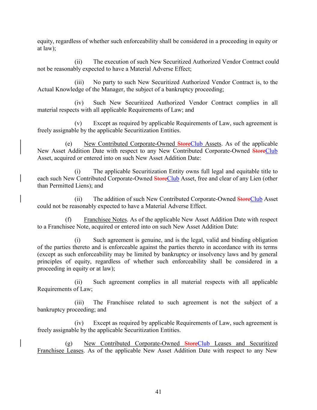 equity, regardless of whether such enforceability shall be considered in a proceeding in equity or at law); (ii) The execution of such New Securitized Authorized Vendor Contract could not be reasonably expected to have a Material Adverse Effect; (iii) No party to such New Securitized Authorized Vendor Contract is, to the Actual Knowledge of the Manager, the subject of a bankruptcy proceeding; (iv) Such New Securitized Authorized Vendor Contract complies in all material respects with all applicable Requirements of Law; and (v) Except as required by applicable Requirements of Law, such agreement is freely assignable by the applicable Securitization Entities. (e) New Contributed Corporate-Owned StoreClub Assets. As of the applicable New Asset Addition Date with respect to any New Contributed Corporate-Owned StoreClub Asset, acquired or entered into on such New Asset Addition Date: (i) The applicable Securitization Entity owns full legal and equitable title to each such New Contributed Corporate-Owned StoreClub Asset, free and clear of any Lien (other than Permitted Liens); and (ii) The addition of such New Contributed Corporate-Owned StoreClub Asset could not be reasonably expected to have a Material Adverse Effect. (f) Franchisee Notes. As of the applicable New Asset Addition Date with respect to a Franchisee Note, acquired or entered into on such New Asset Addition Date: (i) Such agreement is genuine, and is the legal, valid and binding obligation of the parties thereto and is enforceable against the parties thereto in accordance with its terms (except as such enforceability may be limited by bankruptcy or insolvency laws and by general principles of equity, regardless of whether such enforceability shall be considered in a proceeding in equity or at law); (ii) Such agreement complies in all material respects with all applicable Requirements of Law; (iii) The Franchisee related to such agreement is not the subject of a bankruptcy proceeding; and (iv) Except as required by applicable Requirements of Law, such agreement is freely assignable by the applicable Securitization Entities. (g) New Contributed Corporate-Owned StoreClub Leases and Securitized Franchisee Leases. As of the applicable New Asset Addition Date with respect to any New 41